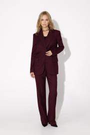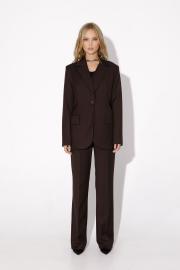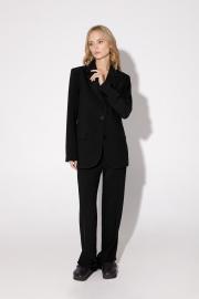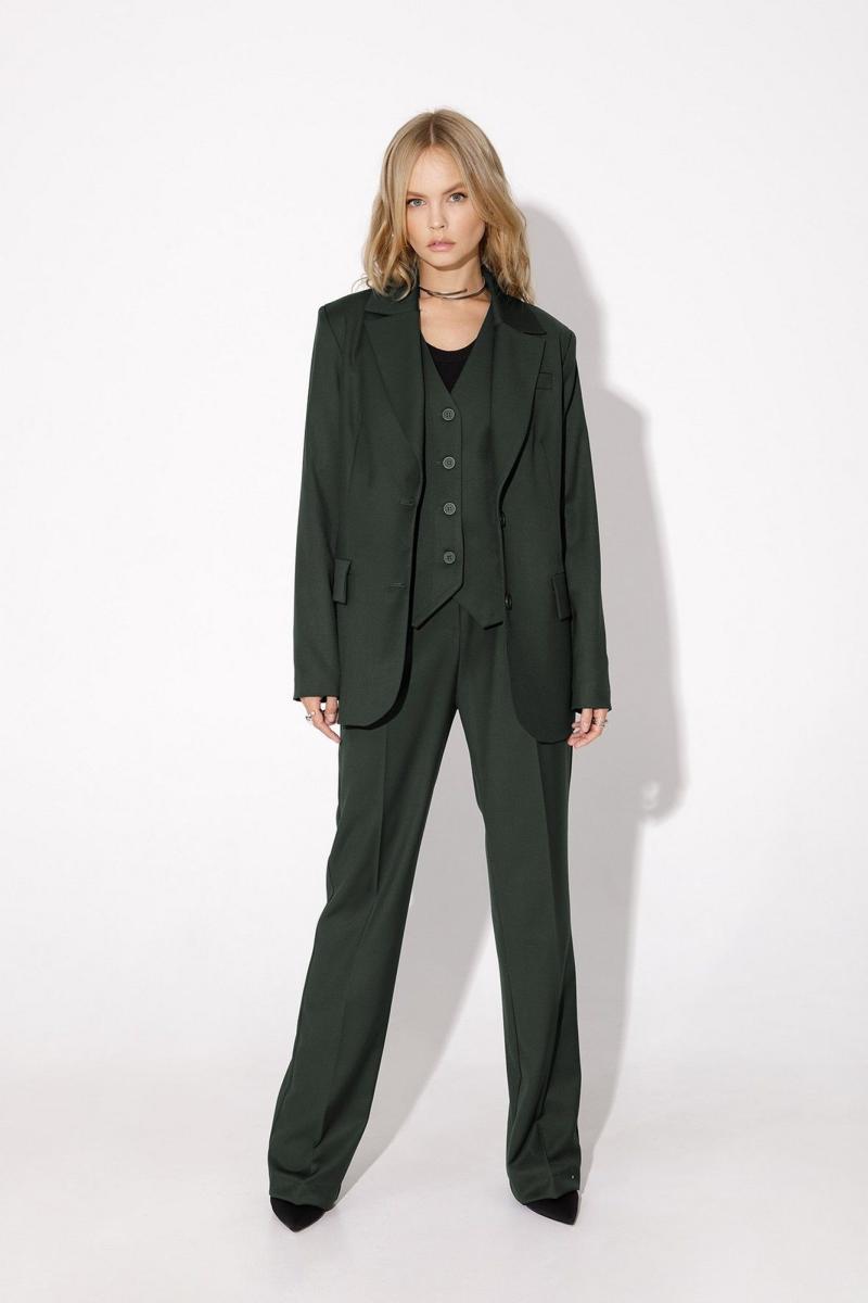 Текстильный костюм-двойка из однобортного жакета и прямых брюк с высокой посадкой. Детали: жакет полуприлегающего силуэта, вытачки по переду и спинке, пиджачный воротник, функциональные карманы, спинка со средним швом, втачные двухшовные рукава, жакет на подкладке. Брюки на притачном поясе со шлевками, передние половины с небольшими мягкими складками и заутюженными стрелками, застежка на молнию и пуговицу, боковые карманы.