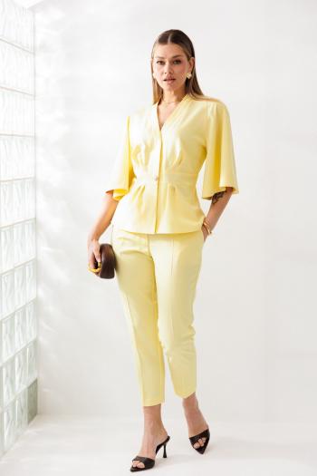 Длина жакета по спинке около 69 см в размерах 40-46 и около 72 см в размерах 48-52, длина рукавов около 62 см. Длина жилета по спинке около 48,5/51,5 см. Длина брюк по боковому шву с поясом около 112,5 в размерах 40-46 и около 114 см в размерах 48-52, длина по внутреннему шву около 80 см.