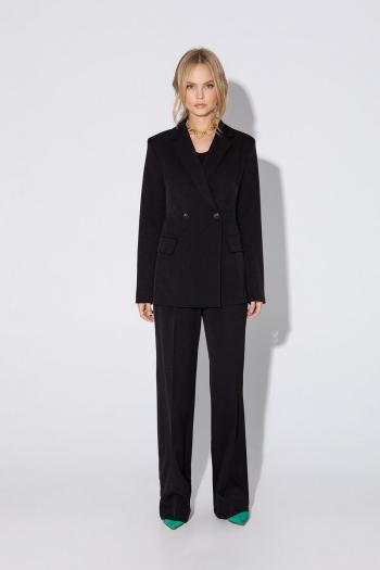 Костюм-двойка из укороченного оверсайз жакета с расширенными плечами и широких брюк- палаццо. Детали: прямой силуэт, спущенная линия плеча, пиджачный воротник, перед с функциональным нагрудным карманом, застежка двубортная на петли и пуговицы, рукава втачные двухшовные, жакет на подкладке. Брюки с высокой посадкой на притачном поясе со шлевками, передние половины с небольшими застроченными мягкими складками и заутюженными стрелками, застежка на молнию и пуговицу, боковые карманы.
