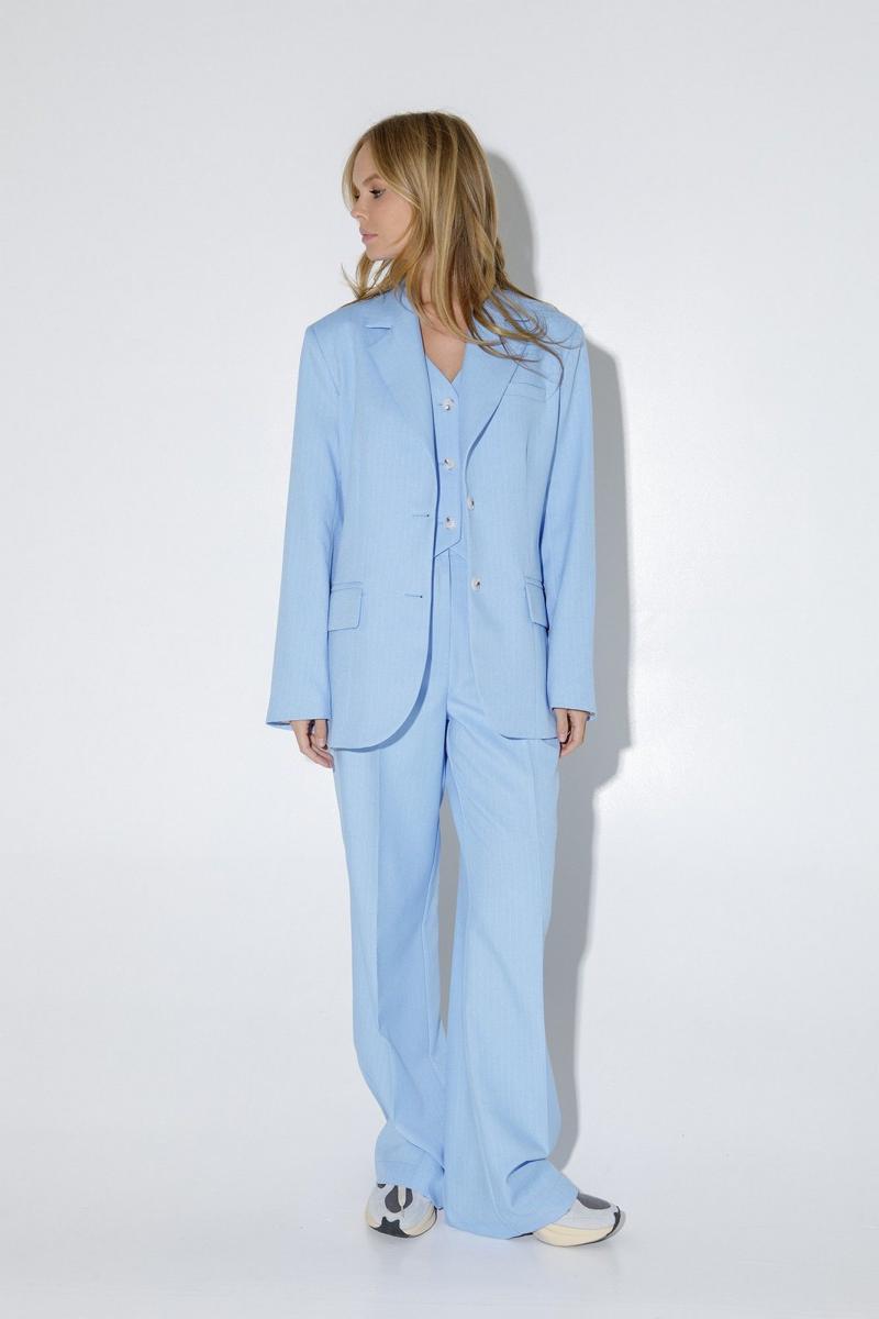 Костюм-тройка из оверсайз жакета, укороченного жилета и прямых широких брюк со стрелками из текстильной ткани в полоску. Детали: жакет прямого силуэта, расширенная линия плеч, пиджачный воротник, перед с прорезными функциональными карманами, однобортная застежка на петли и пуговицы, спинка со средним швом и шлицей, рукава втачные двухшовные, жакет на подкладке. Жилет прямого силуэта с фигурным низом, талиевые вытачки, застежка на петли и пуговицы, функциональные карманы, на подкладке. Брюки с высокой посадкой на притачном поясе со шлевками, застежка на молнию и пуговицу, боковые карманы, передние половины с заутюженными стрелками и двумя небольшими складками. Задние части брюк с вытачками и заутюженными стрелками.