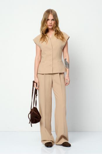Текстильный костюм-двойка из приталенного жакета свободного покроя с разрезами по рукавам и прямых брюк-палаццо со стрелками. Детали: жакет прилегающего силуэта, пиджачный воротник, рельефные швы, перед с прорезными карманами, застежка на петли и пуговицы, спинка со средним швом, рукава втачные двухшовные с высоким разрезом по низу рукавов, жакет на подкладке. Брюки с высокой посадкой на притачном поясе со шлевками, пояс прямой без резинки, застежка на молнию и пуговицу, боковые карманы, передние половины с заутюженными стрелками и двумя небольшими складками. Задние части брюк с вытачками и заутюженными стрелками.