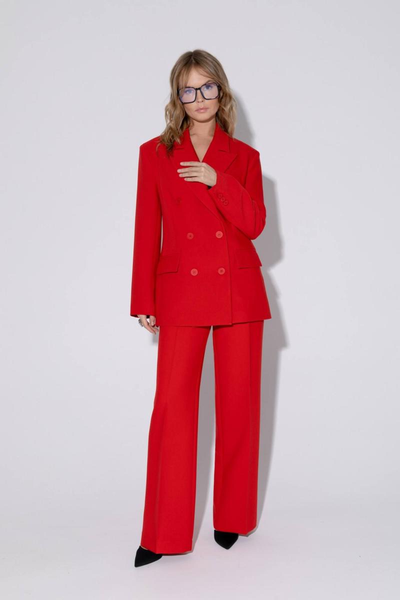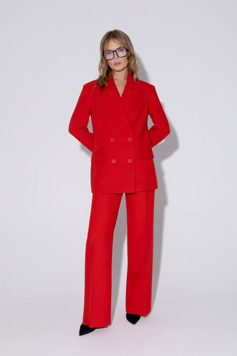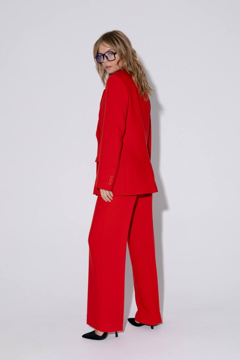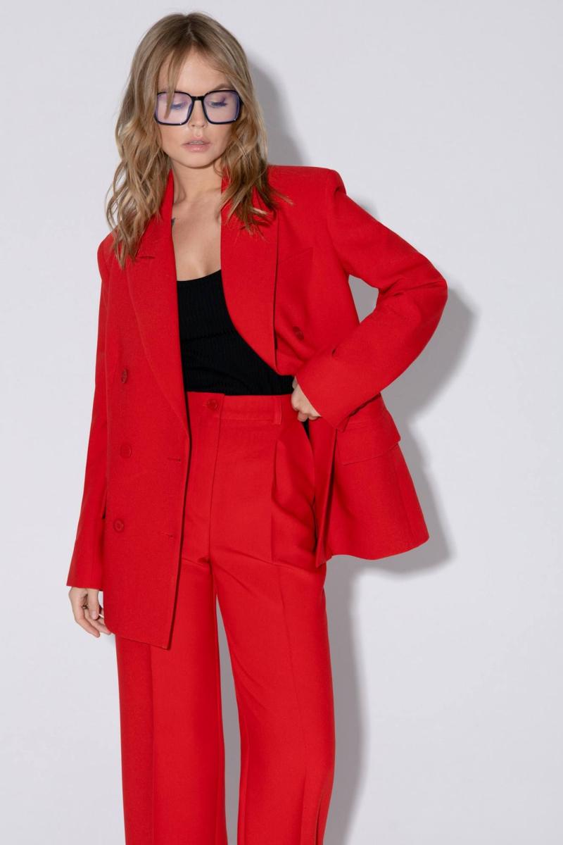 Текстильный костюм-двойка из свободного жакета и прямых брюк со стрелками. Детали: жакет свободного покроя и полуприлегающего силуэта, двубортная застежка на петли и пуговицы, отрезные бочки, пиджачный воротник, функциональные карманы, жакет на подкладке. Брюки с высокой посадкой, притачной пояс со шлевками, передние половины с небольшими застроченными мягкими складками и заутюженными стрелками, застежка на молнию и пуговицу, боковые карманы. Задние части брюк с вытачками и заутюженными стрелками. Пояс брюк прямой, без резинки. Длина жакета по спинке около 69 см в размерах 40-46 и около 72 см в размерах 48-52, длина рукавов около 62 см. Длина брюк по боковому шву с поясом около 114 в размерах 40-46 и около 115,5 см в размерах 48-52. Длина по внутреннему шву около 83 см