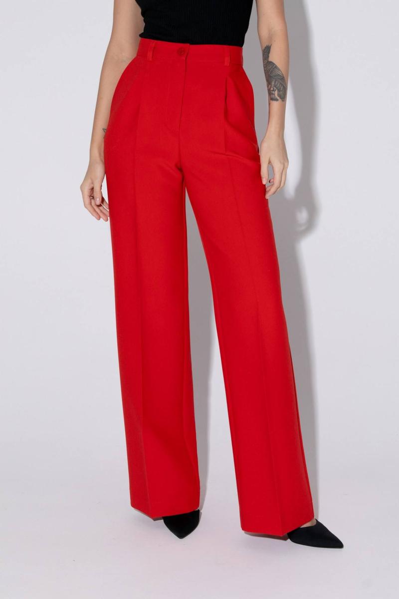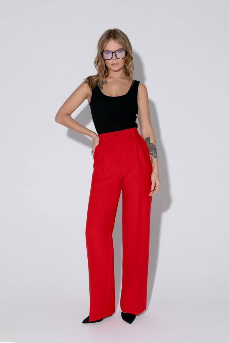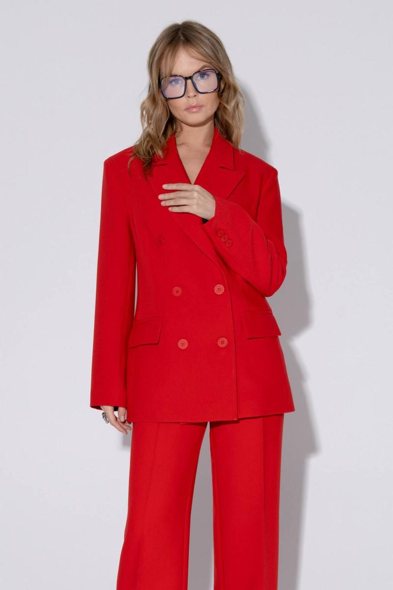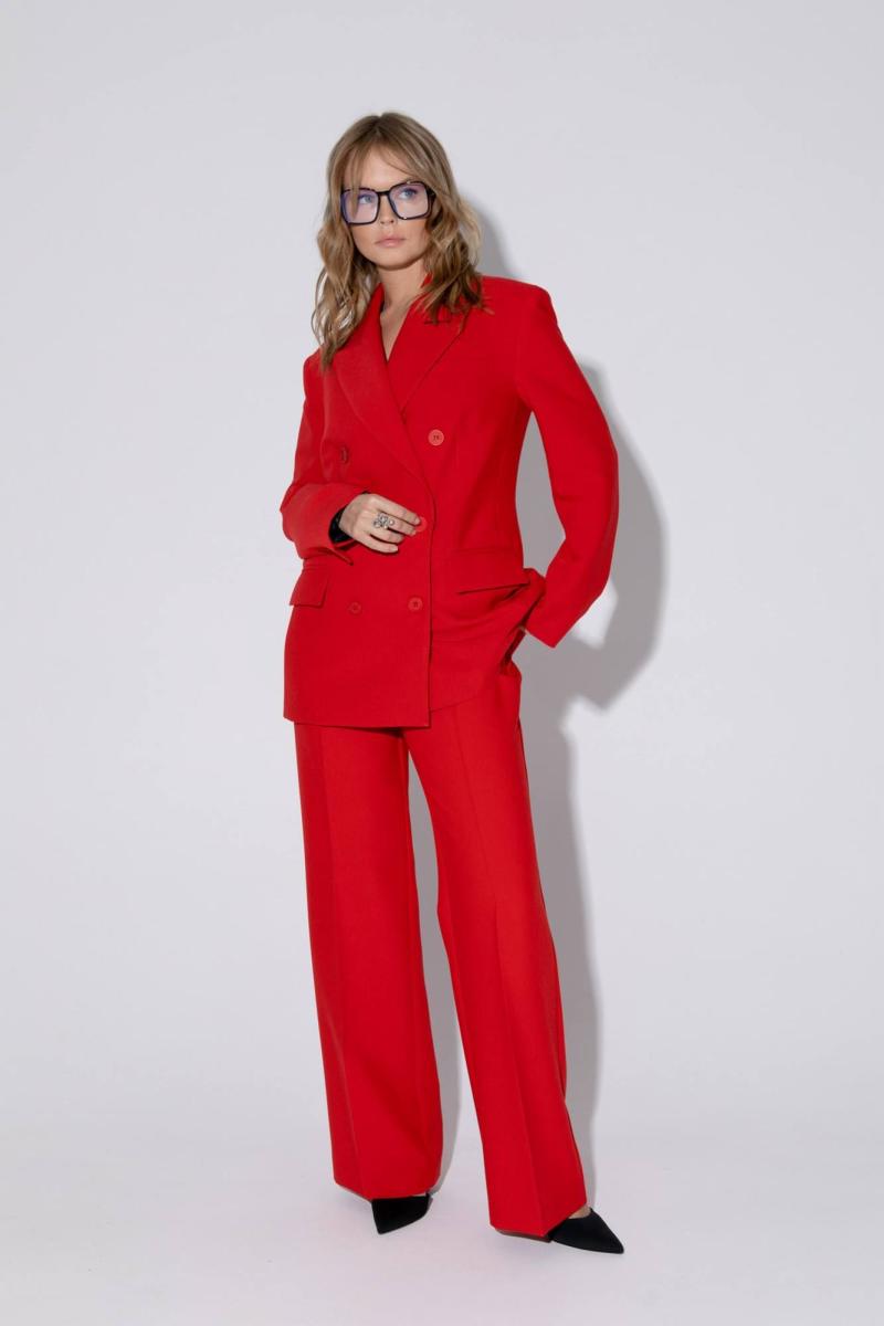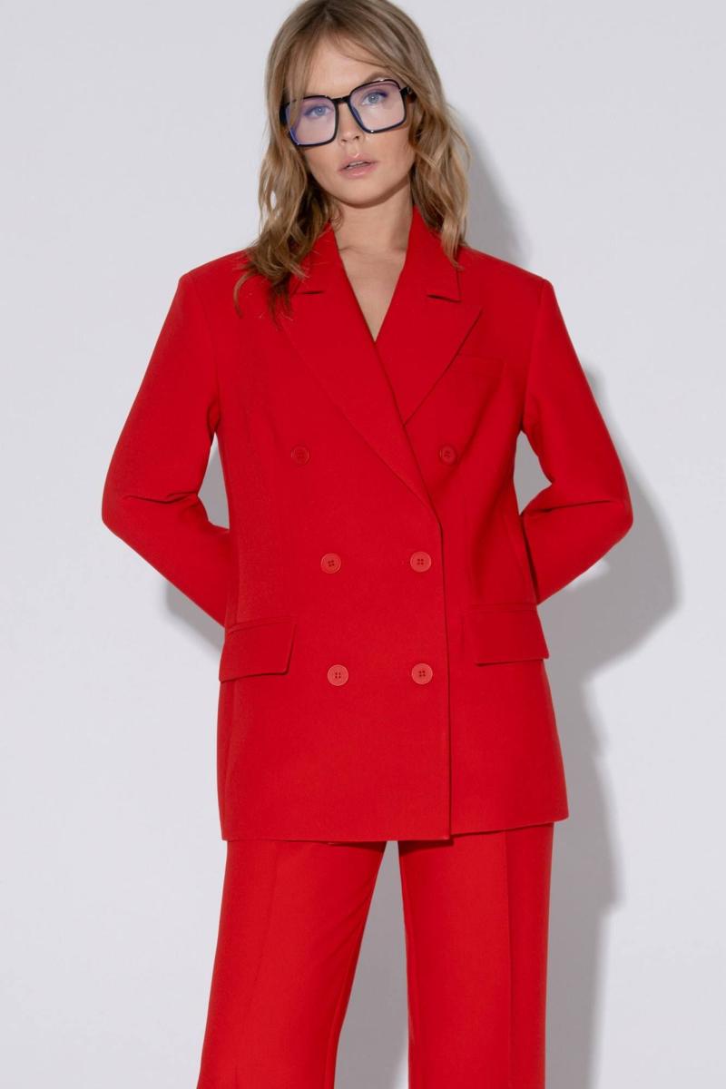 Текстильный костюм-двойка из свободного жакета и прямых брюк со стрелками. Детали: жакет свободного покроя и полуприлегающего силуэта, двубортная застежка на петли и пуговицы, отрезные бочки, пиджачный воротник, функциональные карманы, жакет на подкладке. Брюки с высокой посадкой, притачной пояс со шлевками, передние половины с небольшими застроченными мягкими складками и заутюженными стрелками, застежка на молнию и пуговицу, боковые карманы. Задние части брюк с вытачками и заутюженными стрелками. Пояс брюк прямой, без резинки. Длина жакета по спинке около 69 см в размерах 40-46 и около 72 см в размерах 48-52, длина рукавов около 62 см. Длина брюк по боковому шву с поясом около 114 в размерах 40-46 и около 115,5 см в размерах 48-52. Длина по внутреннему шву около 83 см