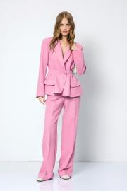 Текстильный костюм-двойка из укороченного приталенного жакета со складками и широких прямых брюк со стрелками.