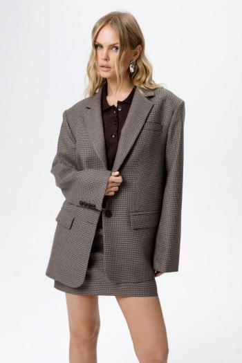 Текстильный костюм-двойка из оверсайз жакета с разрезами по рукавам и широких брюк-палаццо. Детали: жакет свободного покроя, прямой силуэт, застежка на петли и пуговицы, функциональные карманы, жакет на подкладке. Брюки с притачным поясом со шлевками, перед со складками и заутюженными стрелками, застежка на молнию и пуговицу, боковые карманы. Задние части брюк с вытачками и имитацией карманов. Длина жакета по спинке около 71 см в размерах 40-48 и около 73 см в размерах 50-52, длина рукава около 61 см. Длина брюк по боковому шву с поясом около 109,5 см, длина по внутреннему шву около 83 см