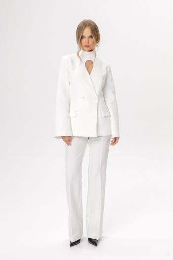 Текстильный костюм-тройка из оверсайз жакета с разрезами по рукавам, полуприлегающего жилета и широких брюк-палаццо. Детали: жакет свободного покроя, прямой силуэт, застежка на петли и пуговицы, функциональные карманы, жакет на подкладке. Жилет полуприлегающего силуэта, талиевые вытачками, застежка на петли и пуговицы, функциональные карманы, фигурный низ, на подкладке. Брюки с притачным поясом со шлевками, перед со складками и заутюженными стрелками, застежка на молнию и пуговицу, боковые карманы. Задние части брюк с вытачками и имитацией карманов. Длина жакета по спинке около 71 см в размерах 40-48 и около 73 см в размерах 50-52, длина рукава около 61 см. Длина жилета по спинке около 48,5 см в размерах 40-46 и около 51,5 см в размерах 48-52. Длина брюк по боковому шву с поясом около 109,5 см, длина по внутреннему шву около 83 см