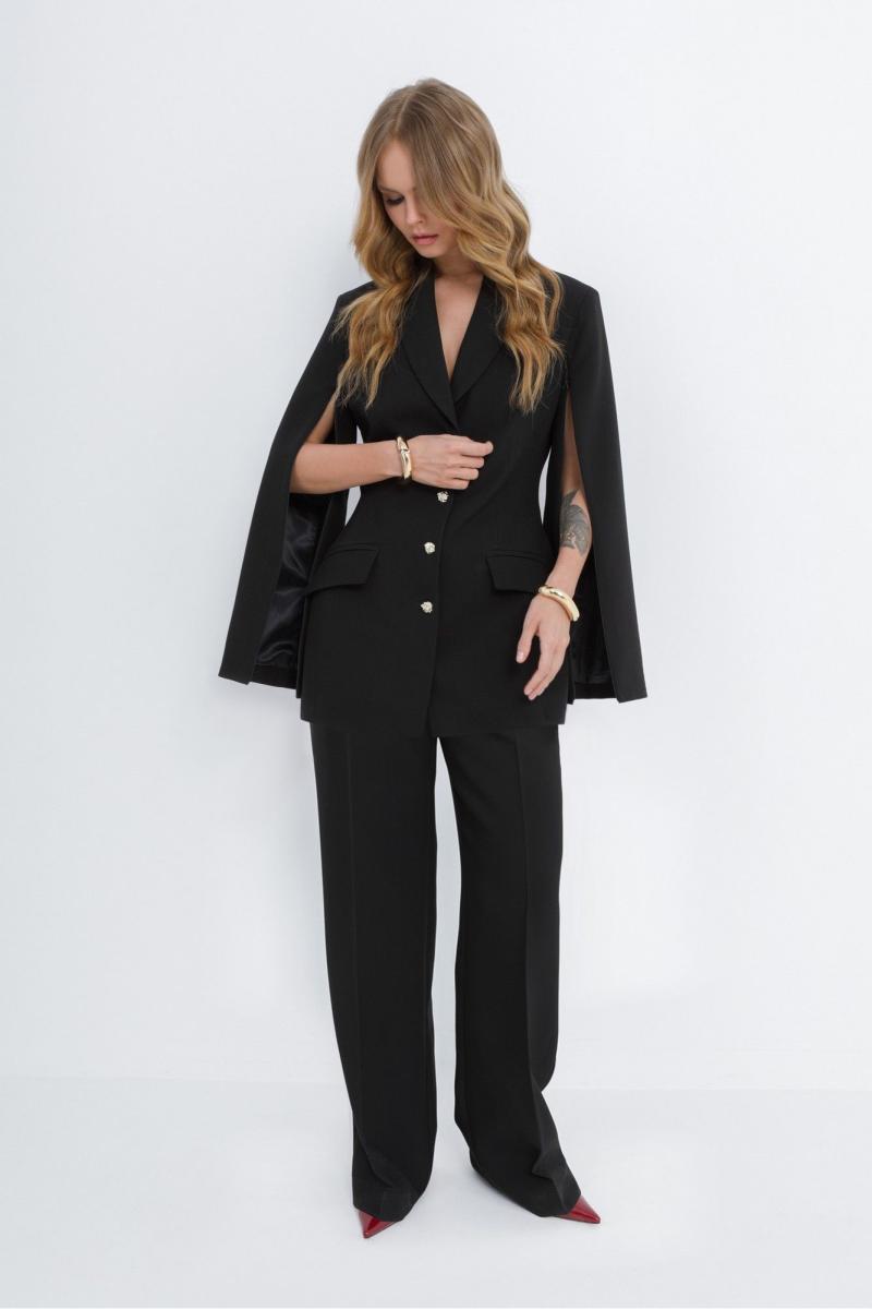 Текстильный костюм-двойка из приталенного жакета с рукавами кейп и прямых широких брюк со стрелками.