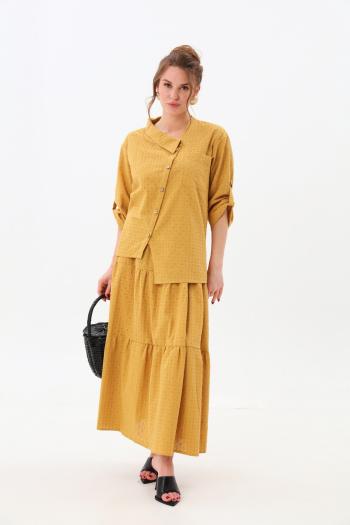Текстильный костюм-двойка из свободного жакета и прямых широких брюк со стрелками.