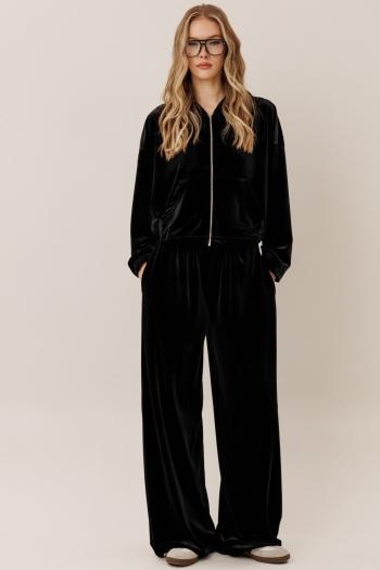 Детали: поло прямого силуэта, свободный покрой, спущенная линия плеча, потайная застежка на петли и пуговицы, длинные рукава. Широкие брюки-палаццо с небольшими складками у пояса и заутюженными стрелками, притачной пояс со шлевками, застежка на молнию и пуговицу, боковые карманы. Задние части брюк с вытачками и имитацией карманов.