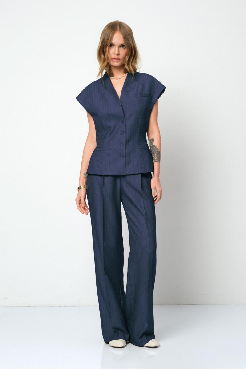 Костюм-двойка из приталенного жилета с воротником-стойкой и широких прямых брюк из текстильной ткани с рисунком «ёлочка». Детали: полуприлегающий силуэт, цельнокроеный воротник-стойка, рельефные швы переда и спинки, функциональные карманы, застежка на петли и пуговицы, жилет на подкладке. Брюки с притачным поясом со шлевками, передние половины с небольшими застроченными мягкими складками и заутюженными стрелками, застежка на молнию и пуговицу, боковые карманы. Задние части брюк с вытачками и заутюженными стрелками. Пояс брюк прямой, без резинки. Длина жилета по спинке около 54 см в размерах 40-46 и около 56 см в размерах 48-52. Длина брюк по боковому шву с поясом около 114 см в размерах 40-46 и около 115,5 см в размерах 48-52. Длина по внутреннему шву около 83 см
