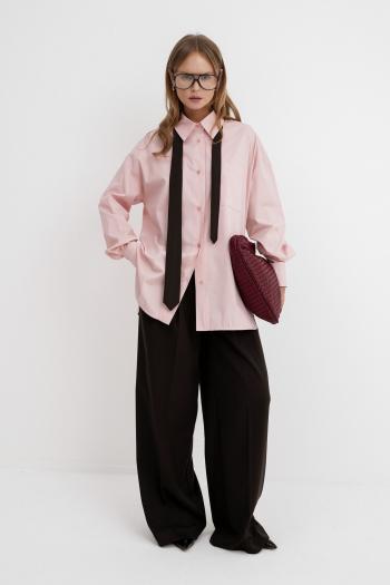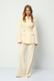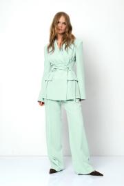 Костюм-двойка из жакета со шнуровкой и широких прямых брюк. Детали: жакет полуприлегающего силуэта, рельефы, пиджачный воротник, застежка на две петли и пуговицы, функциональные карманы, жакет на подкладке. Жакет также можно зашнуровать по бокам. Брюки с притачным поясом со шлевками, передние половины с небольшими застроченными мягкими складками и заутюженными стрелками, застежка на молнию и пуговицу, боковые карманы. Задние части брюк с вытачками и заутюженными стрелками. Пояс брюк прямой, без резинки. Длина жакета по спинке около 68,5 в размерах 40-46 и около 71,5 см в размерах 48-52, длина рукавов около 63 см. Длина брюк по боковому шву с поясом около 114 см в размерах 40-46 и около 115,5 см в размерах 48-52. Длина по внутреннему шву около 83 см