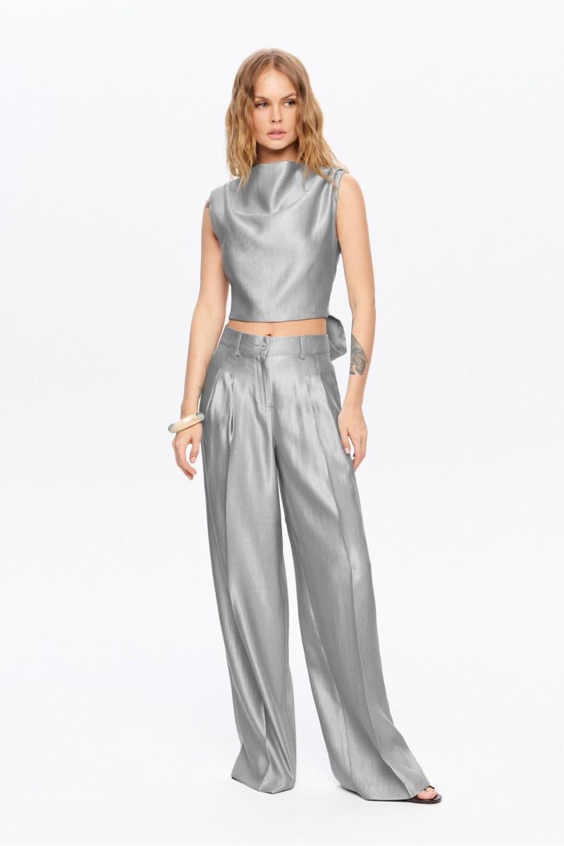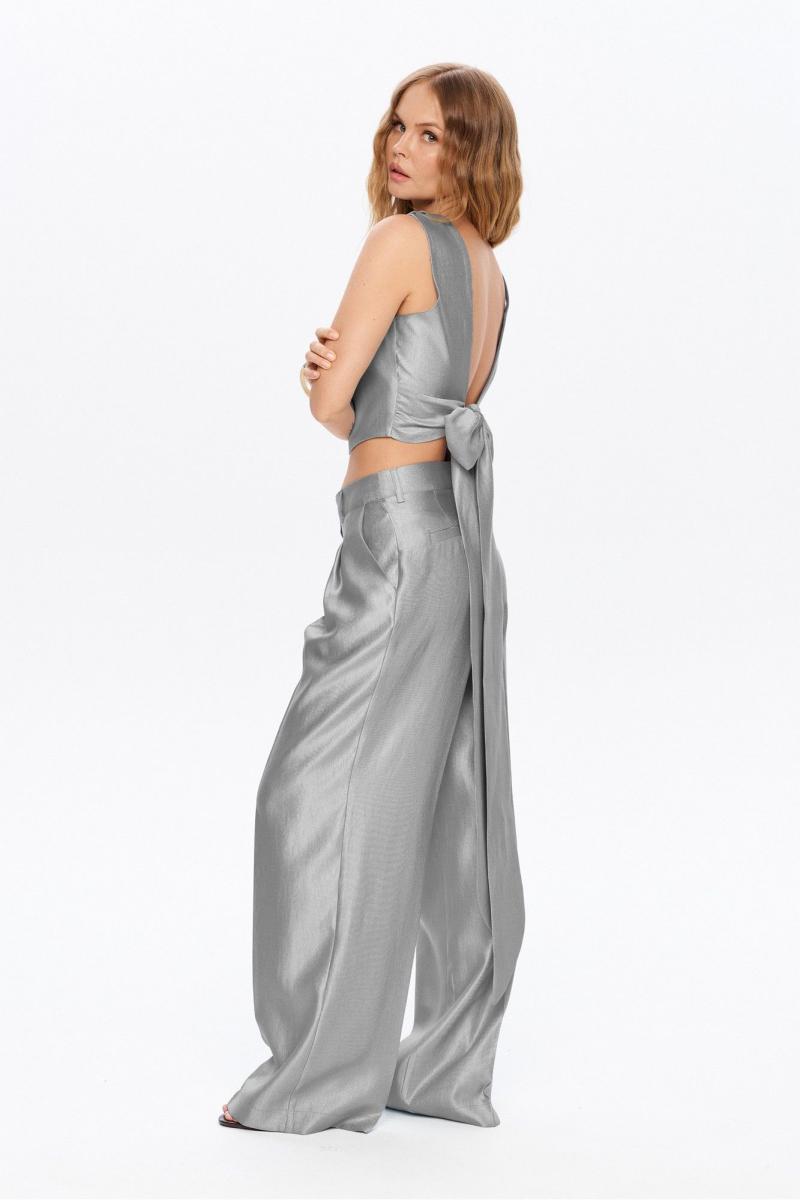 Детали: полуприлегающий силуэт, вырез переда- «качели», топ на подкладке, при помощи поясов можно регулировать прилегание. Также пояса можно завязать спереди. Брюки с притачным поясом со шлевками, складки у пояса, застежка на молнию и пуговицу, боковые карманы. Задние части брюк с вытачками и имитацией карманов.