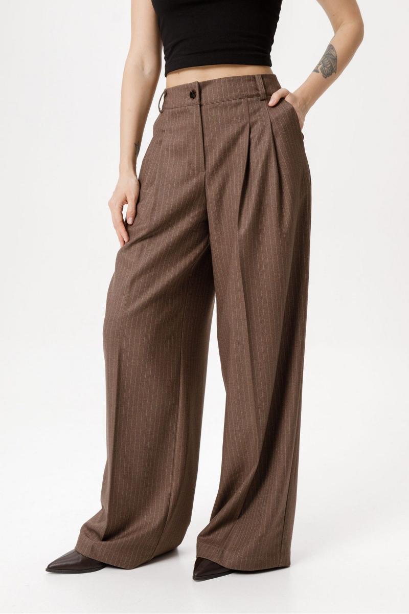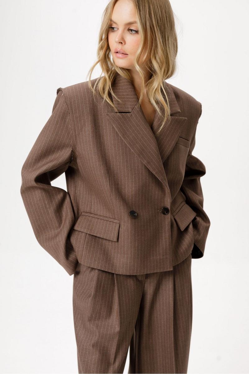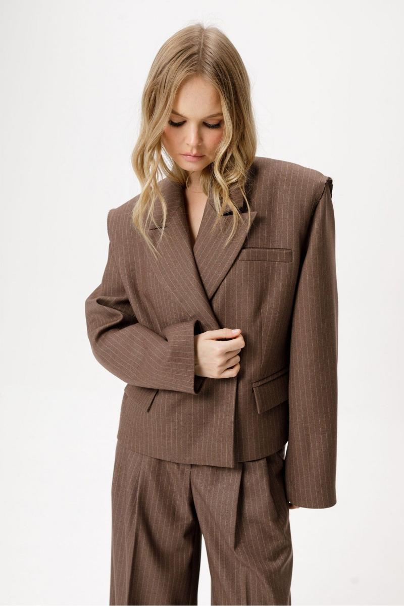 Костюм-двойка из укороченного оверсайз жакета с необработанным краем пройм и широких брюк-палаццо из текстильной ткани в полоску.