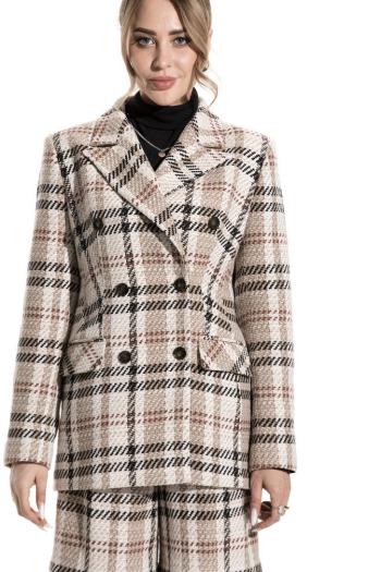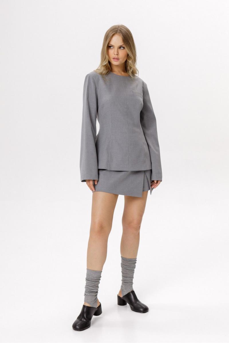 Костюм-двойка из приталенной блузы с рукавами-клёш и мини шорт-юбки из костюмной ткани. Детали: блуза приталенного силуэта с регулировкой по спинке, талевые вытачки и рельефные швы, рукава втачные длинные расклешенные, плечевые накладки, потайная застежка-молния по спинке, блуза на подкладке. Шорты длины мини на запах, застежка на потайную молнию в боковом шве. Длина блузы по спинке около 62 см в размерах 40-46 и около 63 см в размерах 48-52 см, длина рукава около 63 см. Длина шорт по боковому шву с поясом около 37 см в размерах 40-46 и около 40 см в размерах 48-52 см