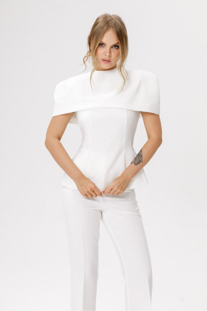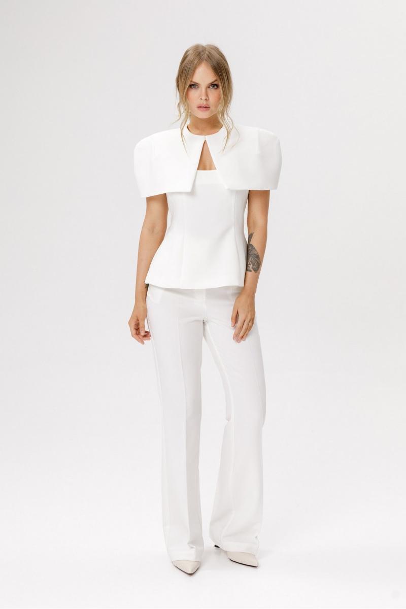 Костюм-тройка из приталенной блузы с укороченным кейпом и брюк-клеш со стрелками.