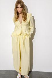 Костюм-двойка из блузы с воланами и широких свободных брюк-алладинов.