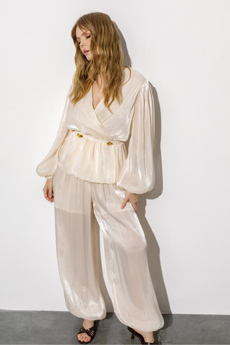 Костюм-двойка из блузы и широких свободных брюк-алладинов из фактурного шифона.