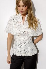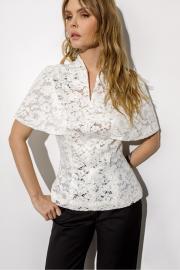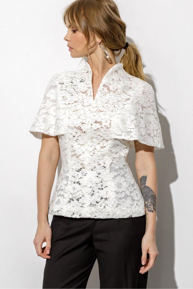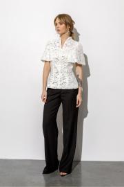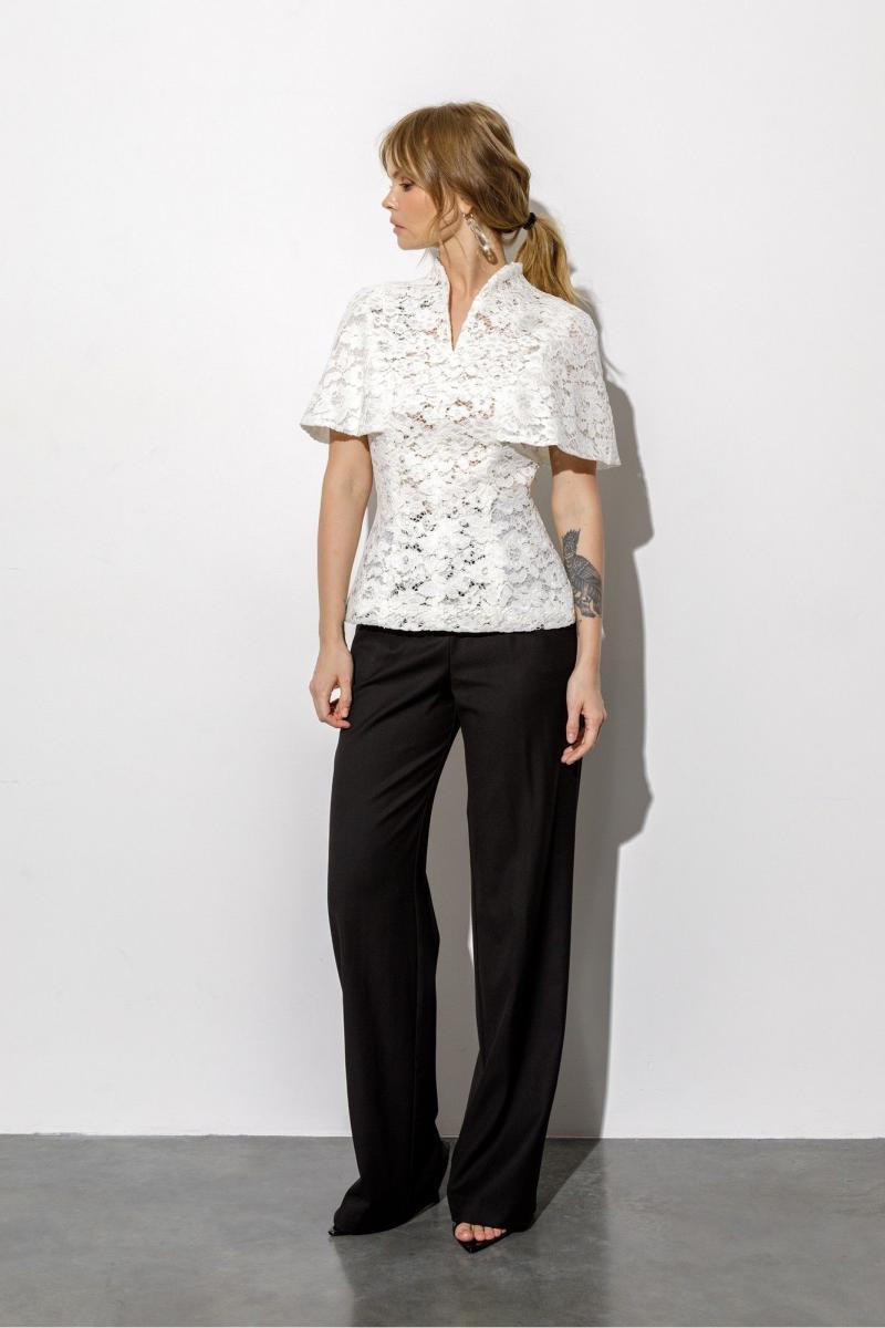 Комплект-двойка из приталенной кружевной блузы-кейпа с цельнокроеной пелериной и прямых широких брюк. Детали: блуза прилегающего силуэта, талиевые вытачки по переду и спинке, цельнокроеная горловина стойка, потайная молния в среднем шве спинки, блуза на подкладке. Брюки с притачным поясом со шлевками, передние половины с небольшими застроченными мягкими складками и заутюженными стрелками, застежка на молнию и пуговицу, боковые карманы. Задние части брюк с вытачками и заутюженными стрелками. Пояс брюк прямой, без резинки. Длина блузы по спинке около 62 см в размерах 40-46, около 65 см в 48-52. Длина брюк по боковому шву с поясом около 114 см в размерах 40-46 и около 115,5 см в размерах 48-52. Длина по внутреннему шву около 83 см