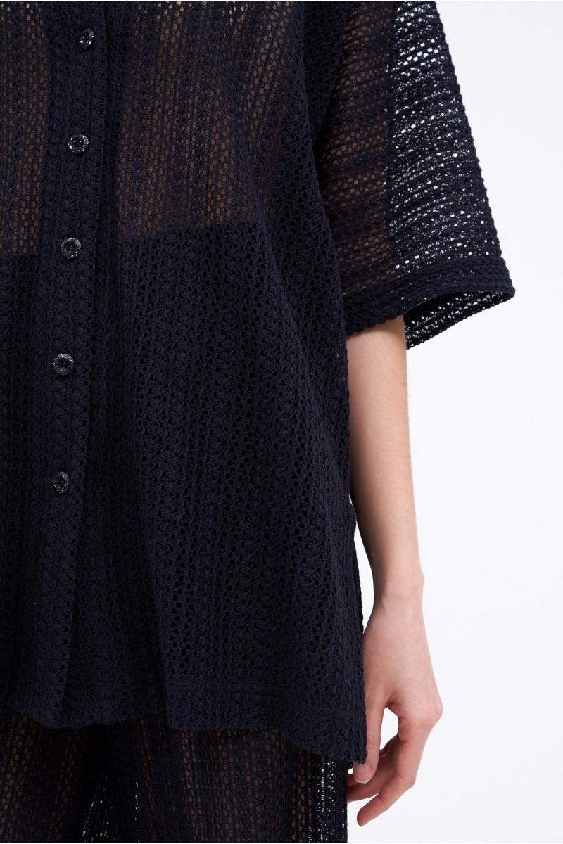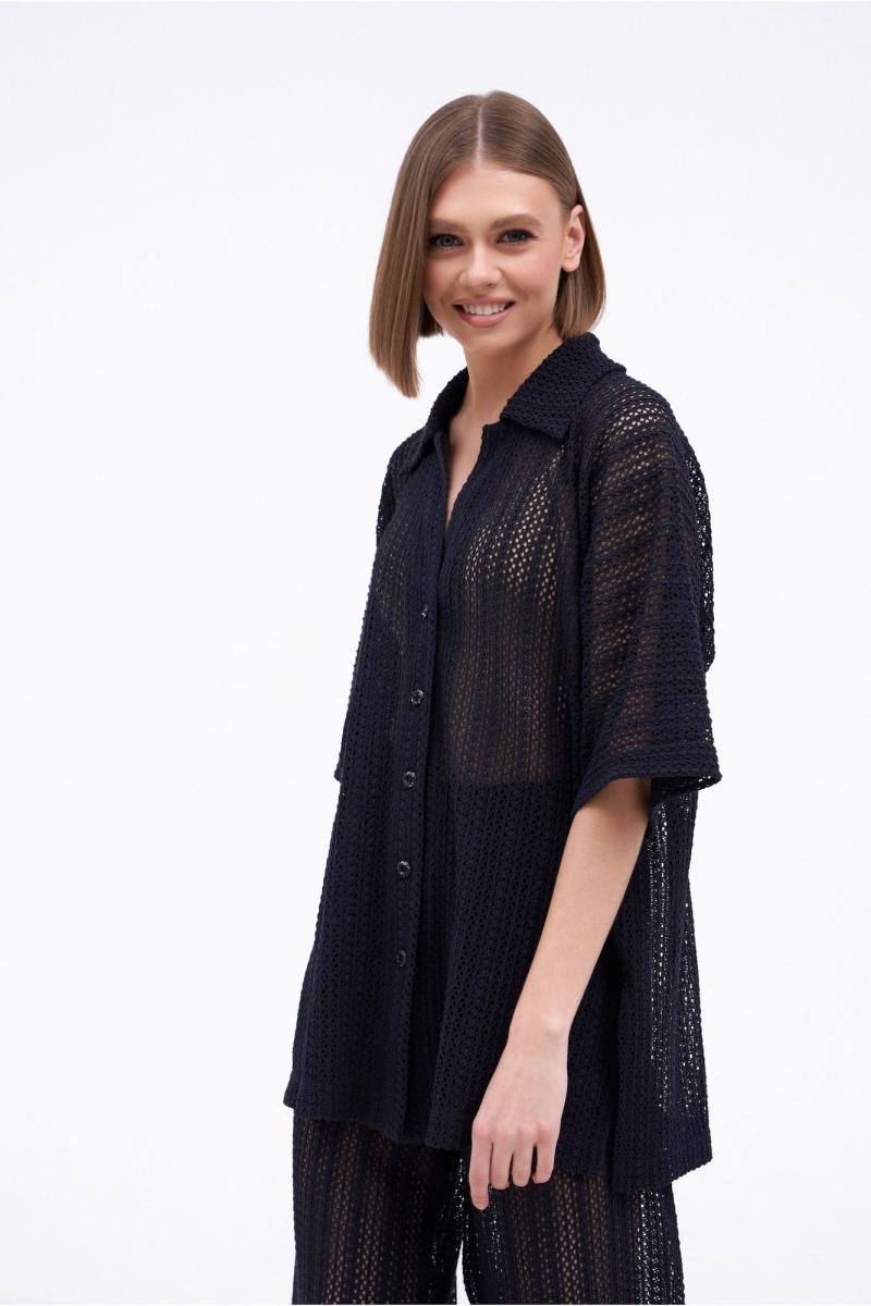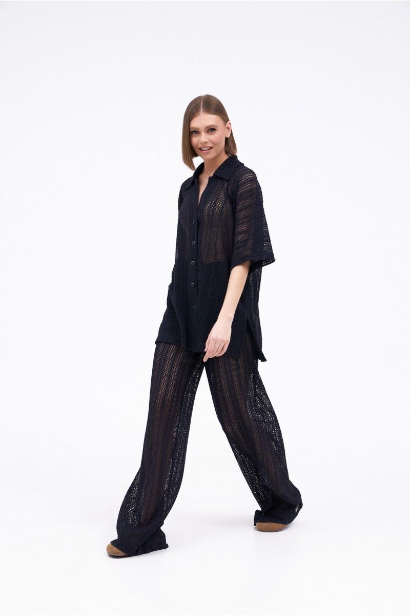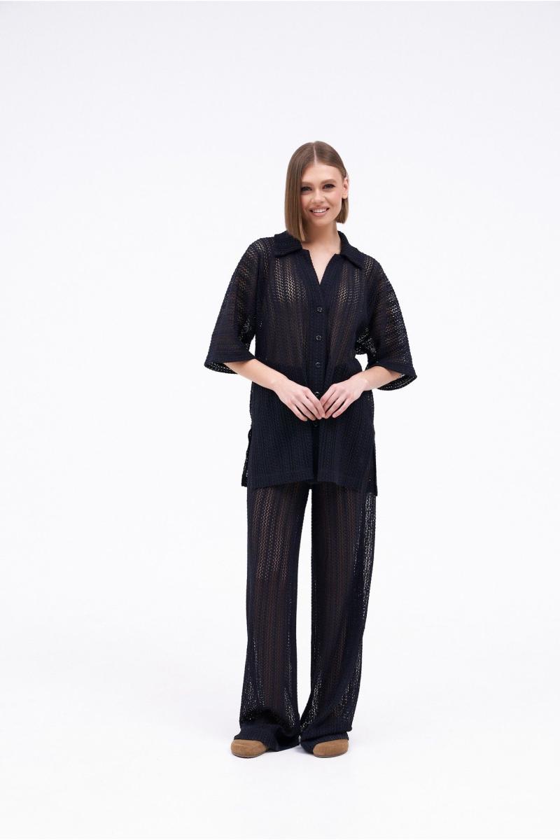 Костюм женский состоящий из блузы и брюк. Блуза свободного силуэта с центральной застежкой на петли пуговицы. Рукав цельнокроеный широкий, длиной от горловины 51 см. Воротник стояче-отложной. По боковым швам расположены 2 разреза. Брюки свободного силуэта, широкие без бокового шва. Верх брюк на подкладке с цельнокроеным поясом на резинке. Длина изделия – 79 см, длина брюк по боку – 120 см