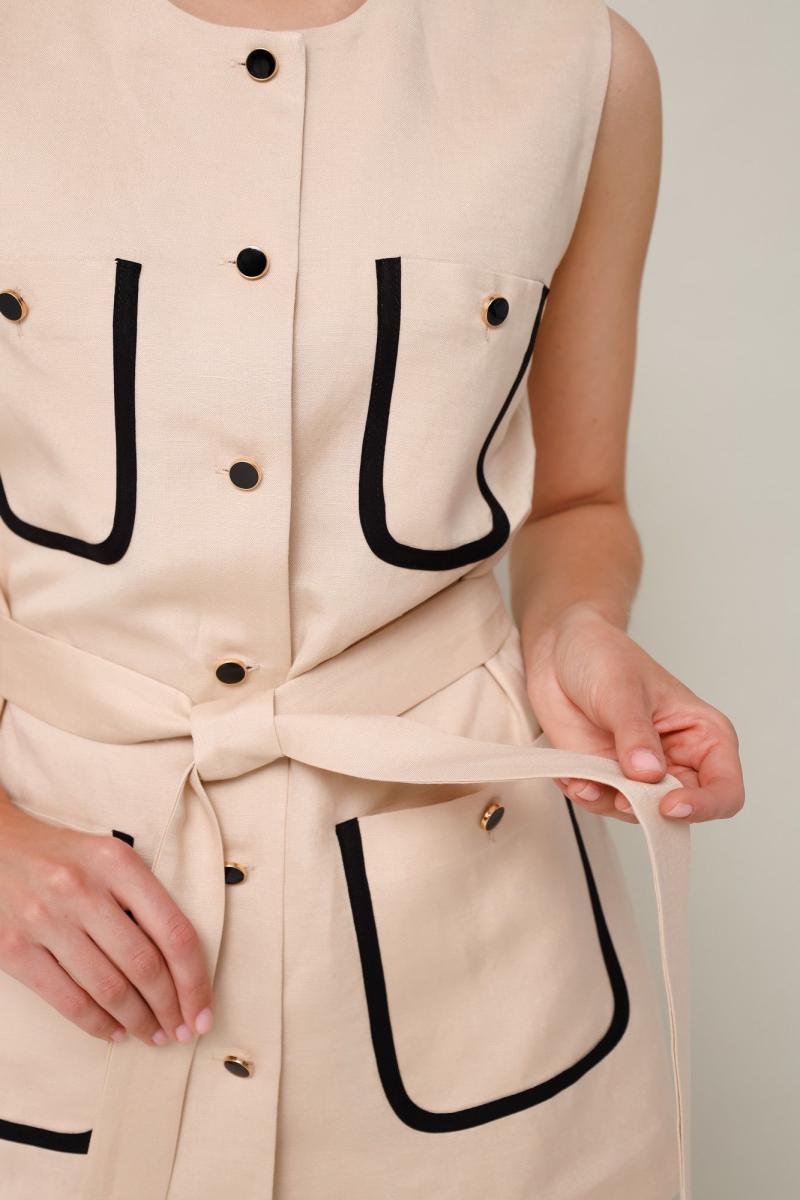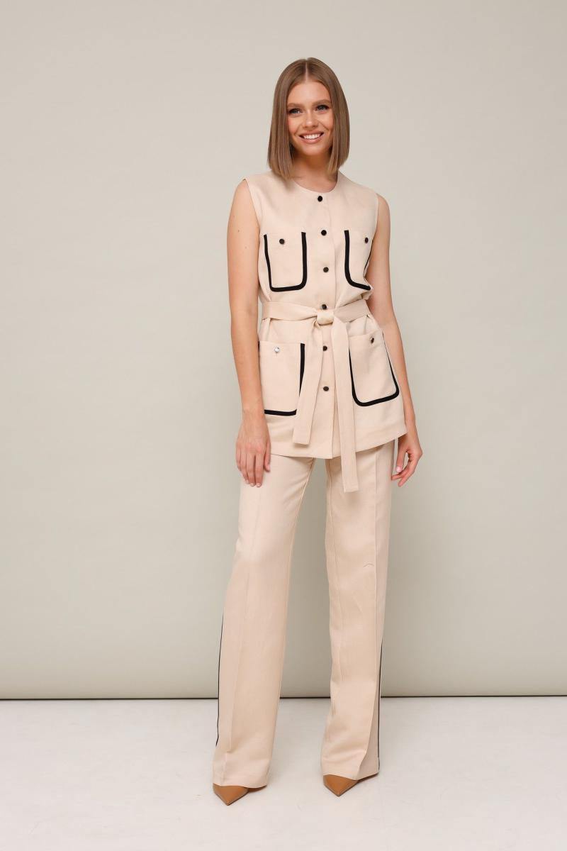 Элегантный 2-х предметный комплект, состоящий их жилета и брюк. Жилет полуприлегающего силуэта с центральной застежкой на петли и пуговицы. Спереди обработаны накладные карманы по линии груди и в области бедер с контрастной окантовкой. Жилет дополнен поясом. Срез обтачки спинки и подборта окантован, без подкладки. Брюки с посадкой на талии, прямого силуэта. В боковых швах контрастный кант. По центру задних половинок застежка на потайную молнию.