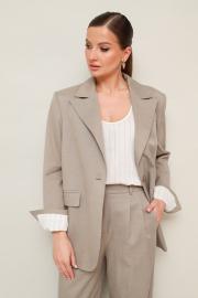 Жакет актуального прямого кроя, с центральной застежкой на петлю и пуговицу. Воротник пиджачного типа с отложными лацканами. Спереди обработаны прорезные карманы в рамку с клапанами и нагрудный прорезной карман с листочкой. Рукава втачные двухшовные со шлицей из отделочной ткани.