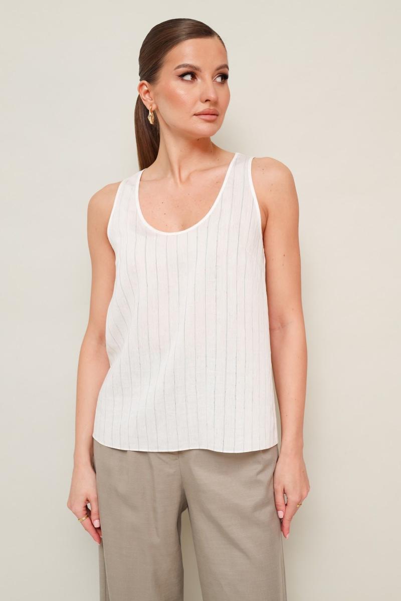 Брюки с посадкой на талии и защипами от пояса, с боковыми наклонными карманами. Пояс притачной с застежкой на пуговицу и тесьму-молнию, по спинке пояс на резинке для регуляции размера.Элегантная базовая блузка прямого силуэта с широкими бретелями.