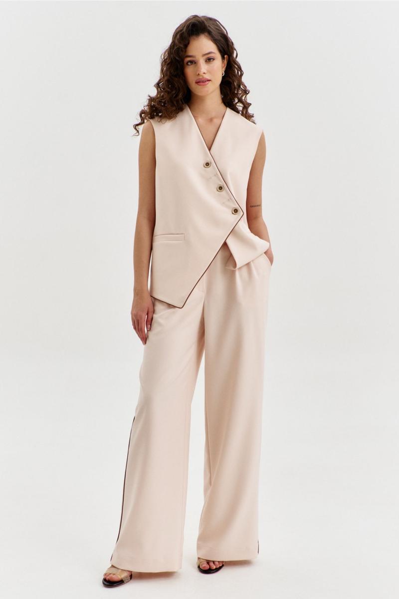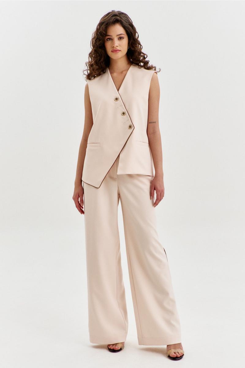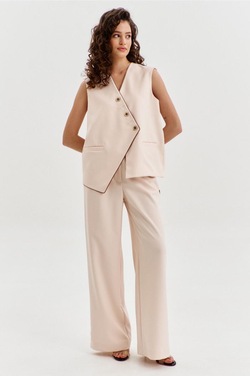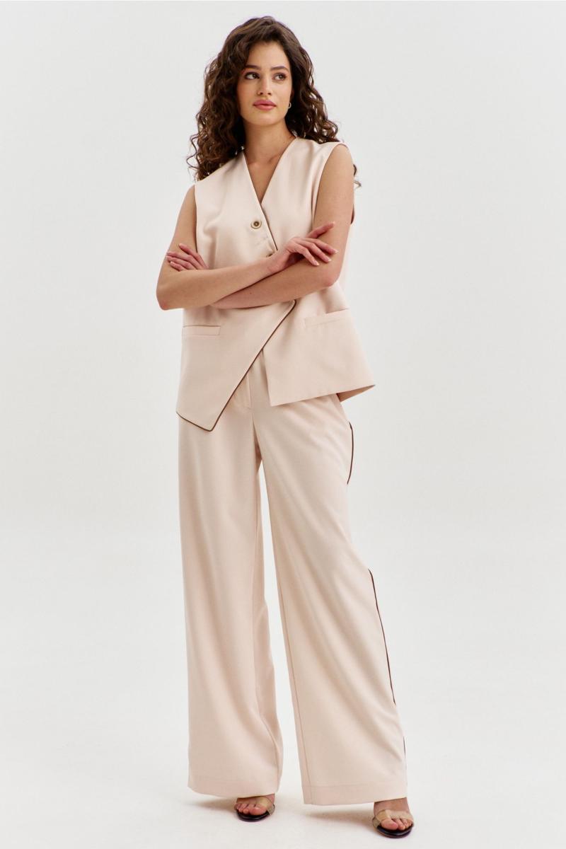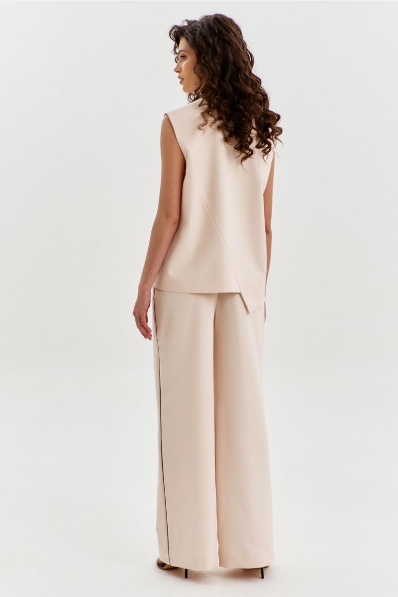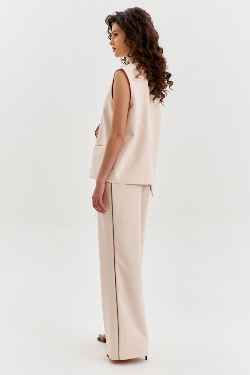 Комплект, состоящий из жилетки и брюк. Жилетка свободного кроя, длиной чуть выше линии бедер, с ассиметричной линией низа. Спинка с ассиметричным швом. Перед с прорезными карманами с листочкой. Застежка ассиметричная на петли и пуговицы. Жилетка на подкладке. Брюки длинные, широкие. По задним половинкам талиевые вытачки. По передним половинкам односторонние складки, боковые карманы и застежка на тесьму-«молнию» с гульфиком и откоском. Брюки на притачном поясе, по спинке с резинкой. По поясу вставлены шлевки.