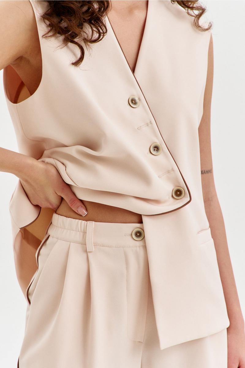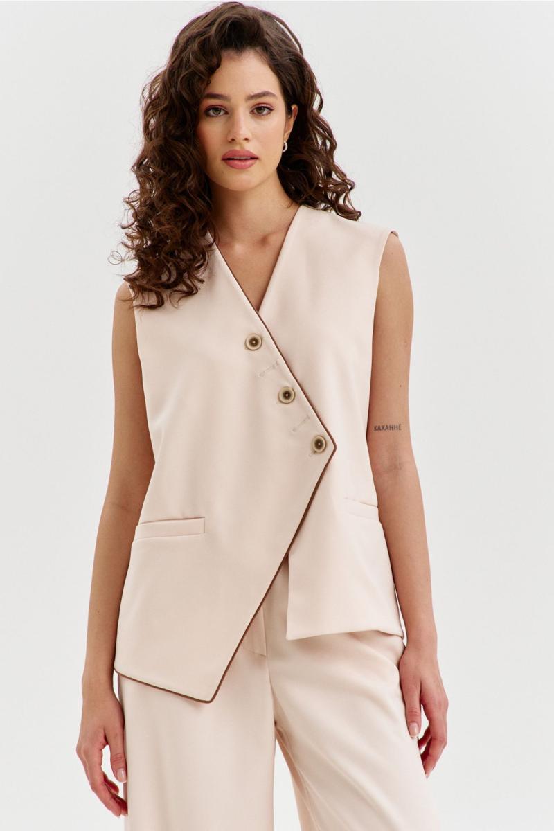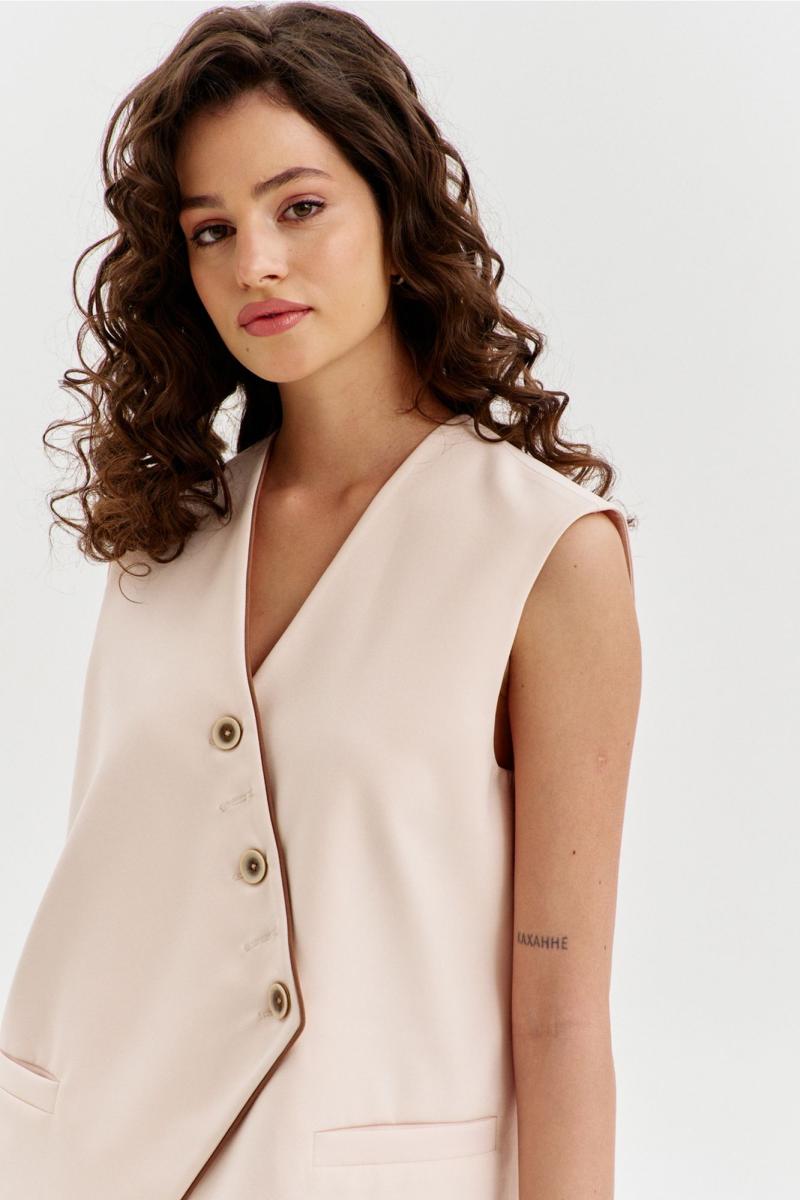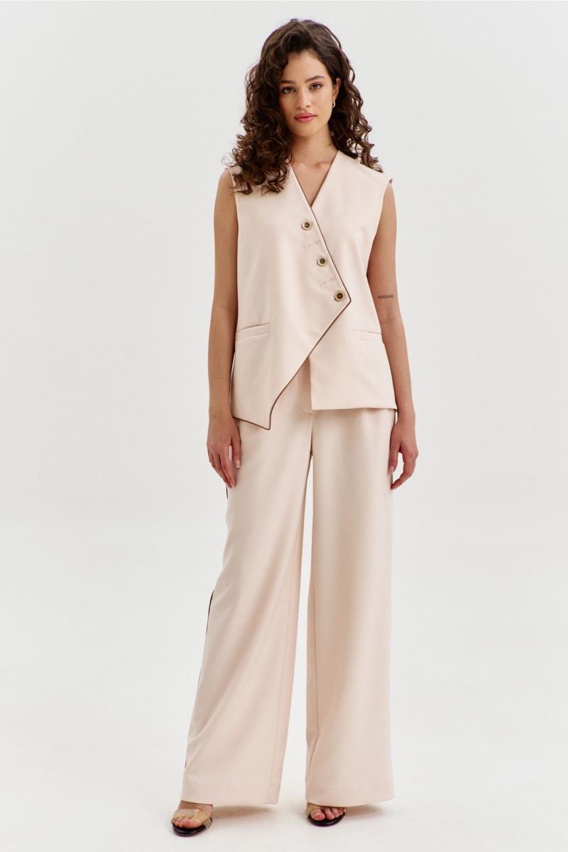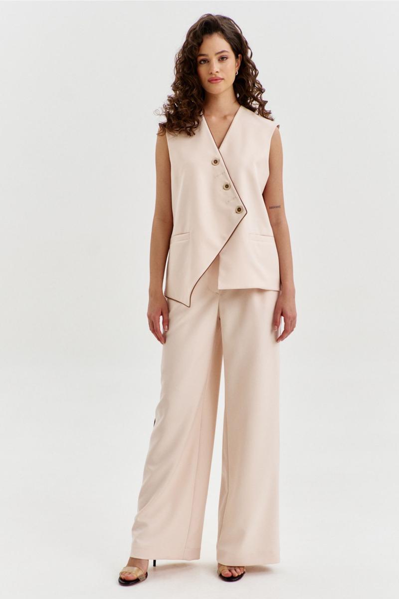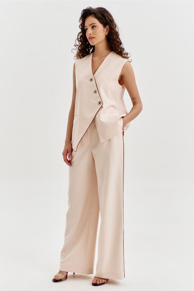 Комплект, состоящий из жилетки и брюк. Жилетка свободного кроя, длиной чуть выше линии бедер, с ассиметричной линией низа. Спинка с ассиметричным швом. Перед с прорезными карманами с листочкой. Застежка ассиметричная на петли и пуговицы. Жилетка на подкладке. Брюки длинные, широкие. По задним половинкам талиевые вытачки. По передним половинкам односторонние складки, боковые карманы и застежка на тесьму-«молнию» с гульфиком и откоском. Брюки на притачном поясе, по спинке с резинкой. По поясу вставлены шлевки.