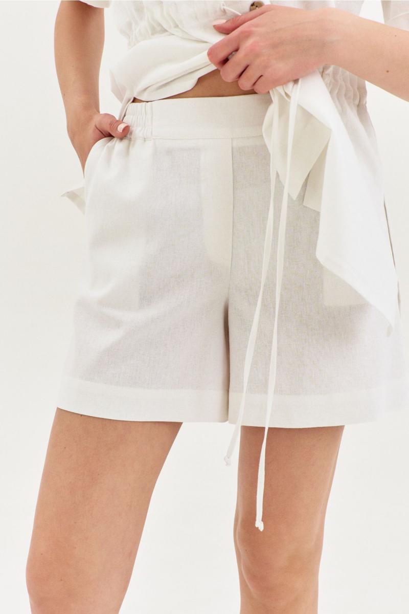 Комплект, состоящий из блузки и шорт. Блузка свободного кроя, длиной чуть ниже линии бедер. Выше линии талии настрочена кулиса и втянут шнур из основной ткани. Перед с нагрудными вытачками. В боковых швах обработаны разрезы. Рукава одношовные, втачные, длиной выше локтя, по низу с цельнокроеной манжетой. Воротник рубашечного типа с отрезной стойкой. Застежка на петли и пуговицы на цельнокроеной планке. Шорты свободного кроя, длиной выше середины бедра. Шорты на притачном поясе с частично вставленной резинкой. По задним половинкам талиевые вытачки. По передним половинкам обработаны боковые карманы с наклонным входом. В среднем шве имитация гульфика.