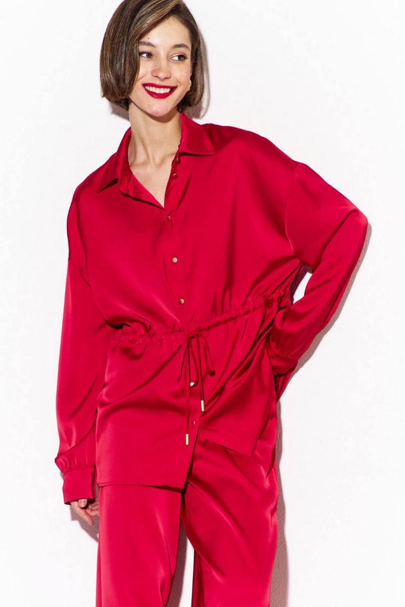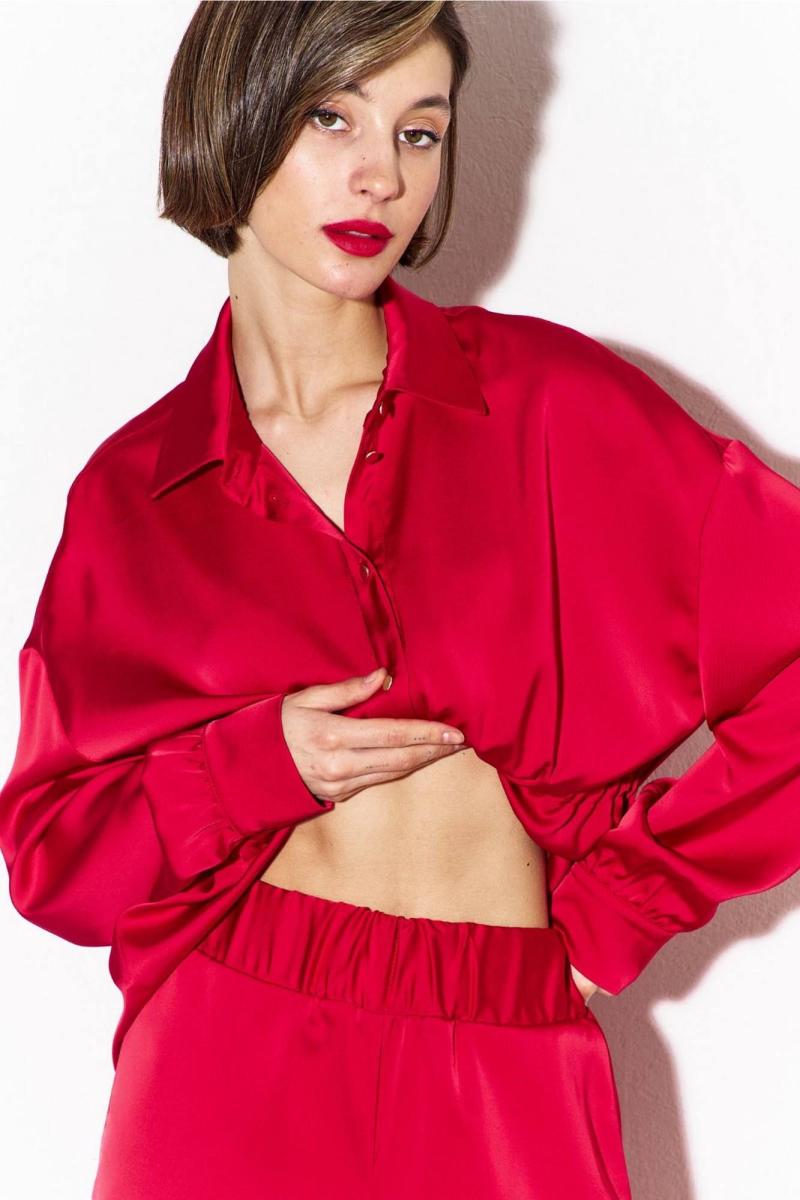 Комплект (брюки и блуза): -блузка прямого силуэта на пуговицах - в талии на шнуровке -воротник рубашечного типа с отрезной стойкой -застежка на петли и пуговицы на цельнокроеной планке -брюки палаццо на притачном поясе с резинкой- -в боковых швах карманы.