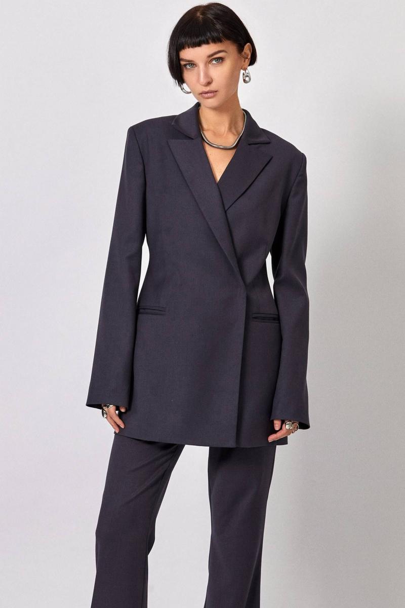 Жакет: - полуприталенный силуэт - пиджачный воротник - спинка со средним швом - карманы без клапанов - застежка на потайные кнопки - без шлёвок - удлинённый, низ прямой. Брюки-клёш от колена: -полуприлегающий силуэт - клёш от колена -в боковых швах карманы -верх с поясом и шлёвками -застёжка на молнию и петлю с пуговицей на поясе