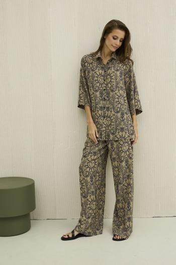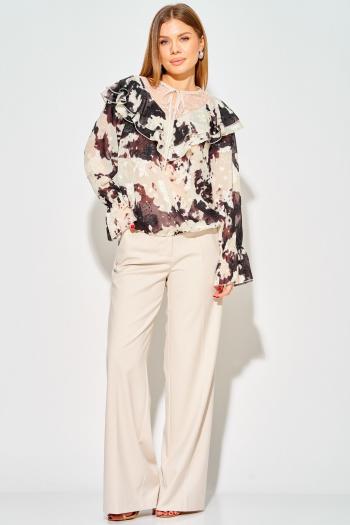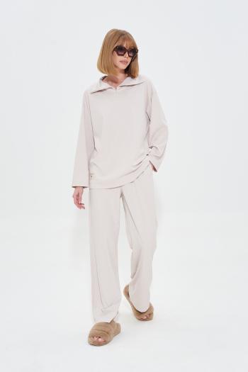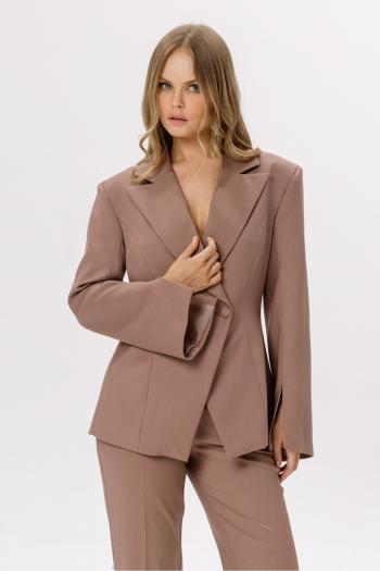 Жакет женский с воротником пиджачного типа, с втачным двухшовным рукавом. Универсальный и базовый жакет с застежкой на пуговицы по центру. В нижней части карманы. Брюки с поясом на резинке из трикотажного полотна. С карманами