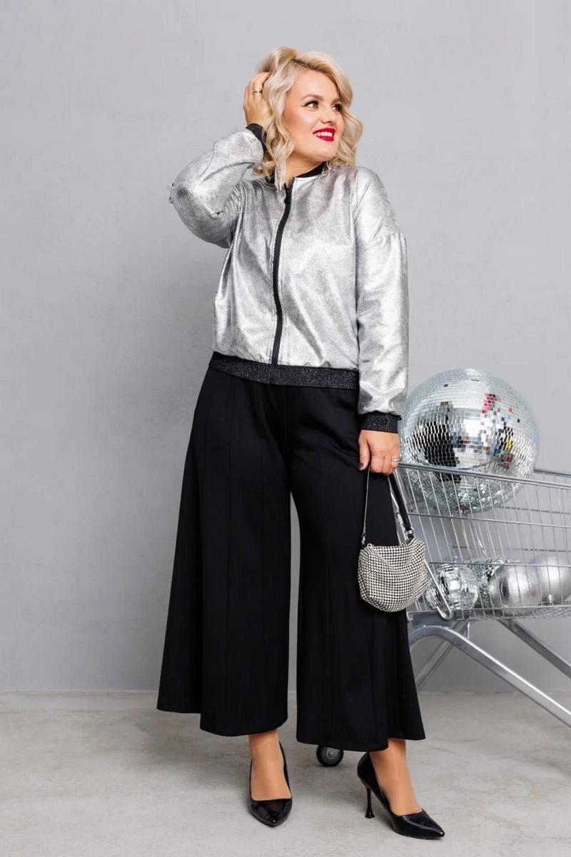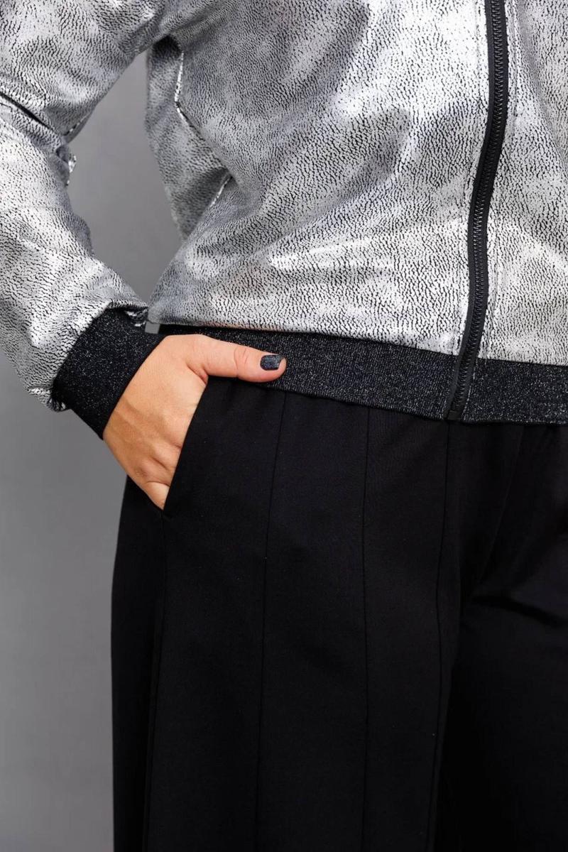 Комплект брючный нарядный в спортивном стиле, универсальный, ткань хорошо тянется, мягкая приятная к телу. Прямой силуэт, линия плеча спущена. Воротник стойка. Брюки из трикотажного полотна с поясом на резинке. С Карманами. Силуэт расширен к низу.