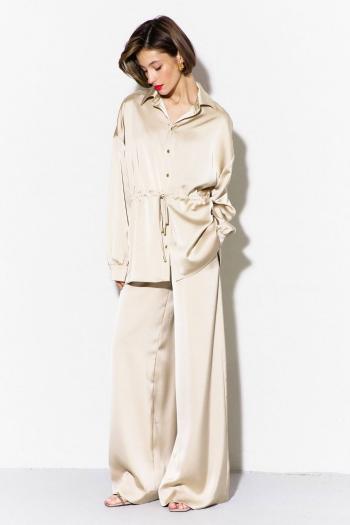 Жилет на подкладке из костюмной ткани, полуприлегающего силуэта, со спущенным плечом, центральной бортовой застежкой на петли и пуговицы. Перед с талиевыми вытачками и листочками. Спинка со средним швом и хлястиком. Длина от плеча по спинке 48. Брюки из костюмной ткани свободного силуэта, с карманами в боковых швах, вытачками на переднем и заднем полотнищах по низу, с гульфиком и застежкой «молнией», на поясе с застежкой на крючки. Длина 100.