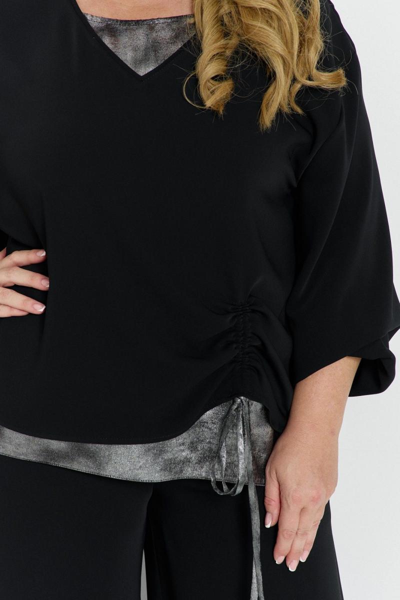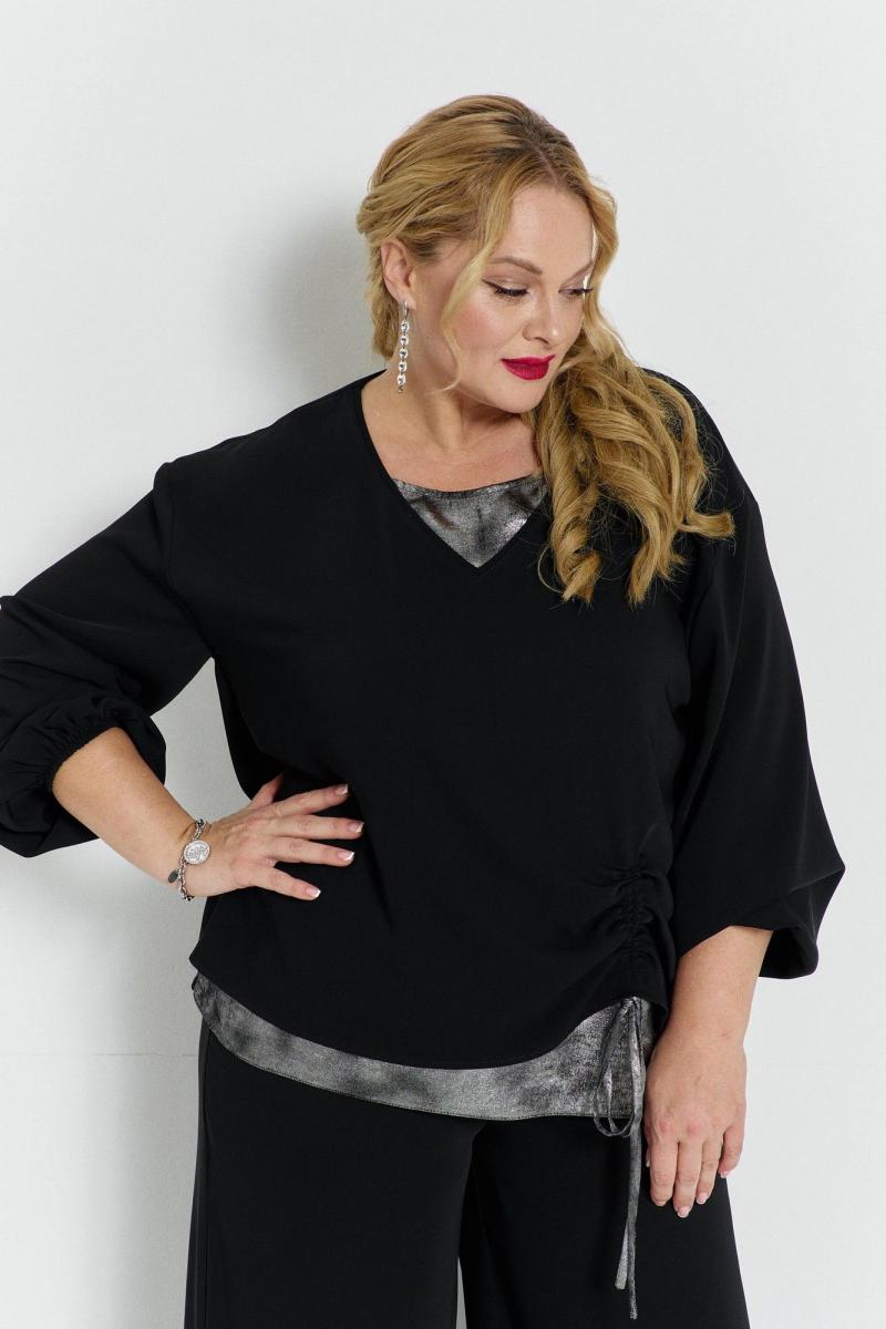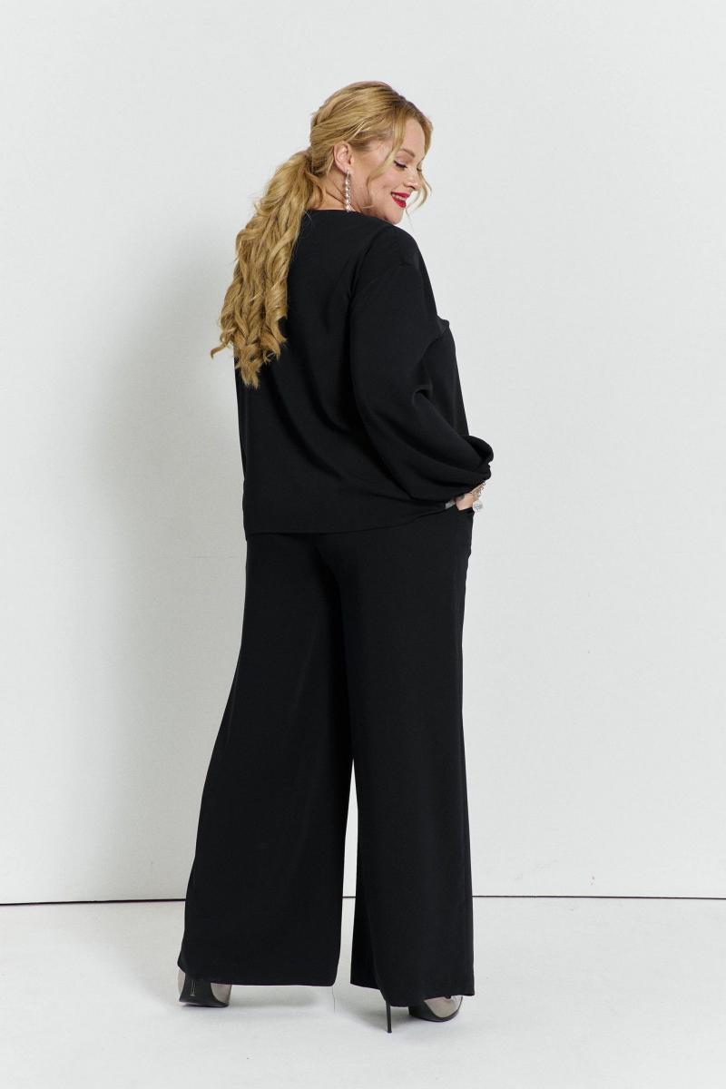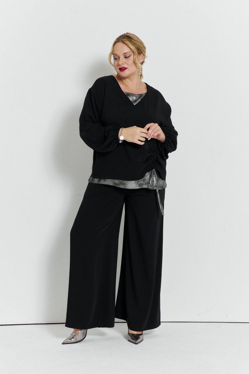 Блуза объёмная, с мягкой линией плеча. V-образный вырез горловины. Подклад переда из другой ткани. Верхняя деталь переда присобирается на кулисе. Низ рукавов на резинке. Длина спинки ок. 66см, длина рукава от нормали ок. 63см. Прямые, широкие брюки с карманами спереди и на поясе с резинкой. Длина сбоку с поясом ок. 106 см. Жакет свободный, с мягкой линией плеча, воротником пиджачного типа с отворотами лацканов и с кокетками на спинке и спереди. В боковых швах обработаны карманы. Длина по спинке ок. 76 см, длина рукава от нормали ок. 64 см.