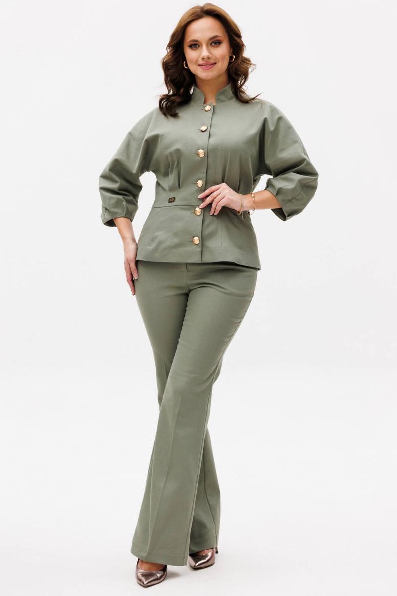 Костюм женский, состоит из жакета и брюк. Жакет приталенного силуэта на подкладке из 100% хлопка. Перед с центральной бортовой застежкой на петли-пуговицы. Перед и спинка отрезные по линии талии со встречными складками выходящими из подреза. На басках обработаны талиевые вытачки. Рукав цельнокроеный типа "летучая мышь" длиной 3/4 с односторонними кладками. Воротник стойка. Брюки клёш от колена с центральной застёжкой на молнию и петлю-пуговицу. По передним и задним половинкам заутюжены канты. В боковых швах карманы. Задние половинки с отрезными кокетками и накладными карманами. Пояс притачной.