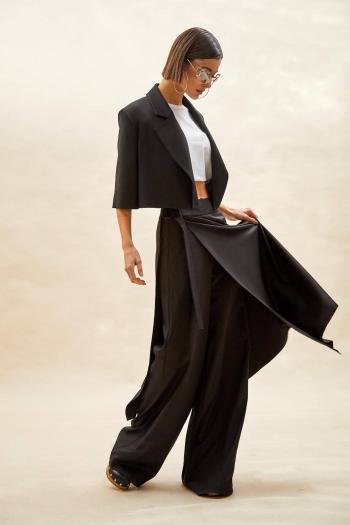 Костюм женский, состоит из туники и брюк. Туника свободного силуэта, с покроем рукава типа "летучая мышь". Застежка в среднем шве спинки на потайную тесьму-молнию. Горловина округлой формы. Низ разно-уровневый. В боковых швах выполнены разрезы. Рукав длинной 3/4, " и манжетой "на запах". Перед и спинка выполнены с декоративными рельефами и втачным кантом. Боковые части спинки и переда выполнены из отделочной ткани контрастного цвета. Брюки Прямого силуэта, с центральной застёжкой на молнию и петлю-пуговицу. В боковых швах карманы. Пояс притачной с резинкой по бокам.