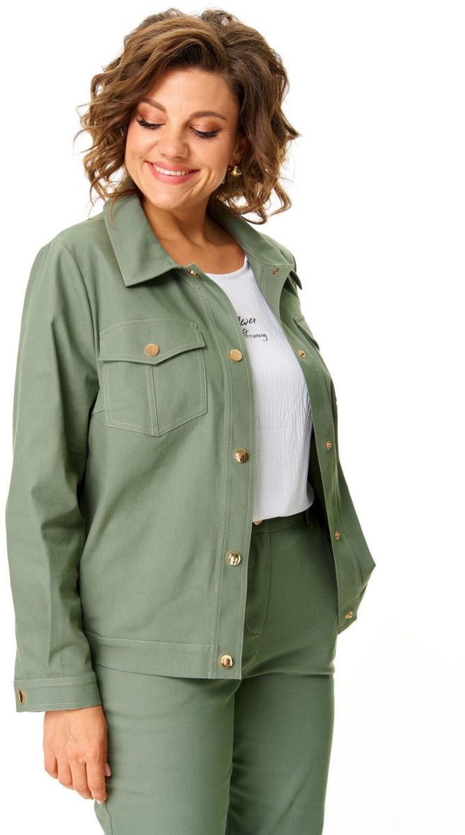 Костюм женский состоит из жакета и брюк. Жакет свободного силуэта с естественной линией плеча.Перед с отрезной планкой и центральной бортовой застежкой на золотые кнопки.По спинке выполнены кокетка и рельефы.По переду имеются накладные карманы авторской формы с клапанами.В боковых швах карманы.Воротник отложной.Рукав длинный с защипами по низу и патой.Низ рукава обработан притачной манжетой с застежкой на золотую кнопку.Низ жакета обработан притачным поясом с резинкой по спинке и некоторой части переда.Брюки зауженные к низу, с центральной застёжкой на молнию и петлю-пуговицу.В боковых швах карманы с отрезным бочком.Пояс притачной с резинкой по бокам.Отделочные строчки контрастного цвета.Вся фурнитура металлическая premium качества.