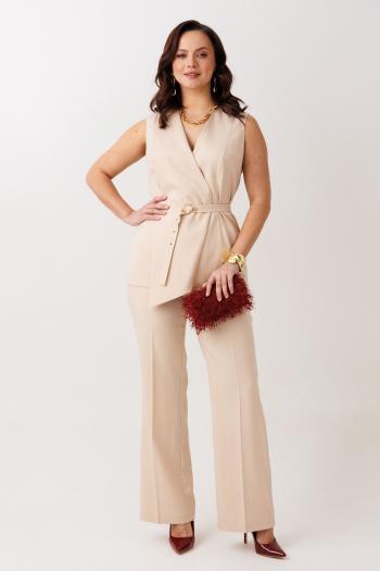 Комплект женский 2-х предметный состоит из блузона и платья в дополнение ремень. Блузон прямого, свободного силуэта, с застёжкой по притачной планке на петли и пуговицы, по боковым швам разрезы. Перед с нагрудными выточками. Рукава одношовные, длиной ¾, с патами фиксируемые длину рукава на петлю и пуговицу. Воротник отложной. Платье полуприлегающего силуэта, с застёжкой по среднему шву спинки на потайную молнию. Перед с нагрудными и талевыми выточками. Спинка с талевыми выточками, средний шов заканчивающийся шлицей. Рукава втачные, одношовные, короткие.