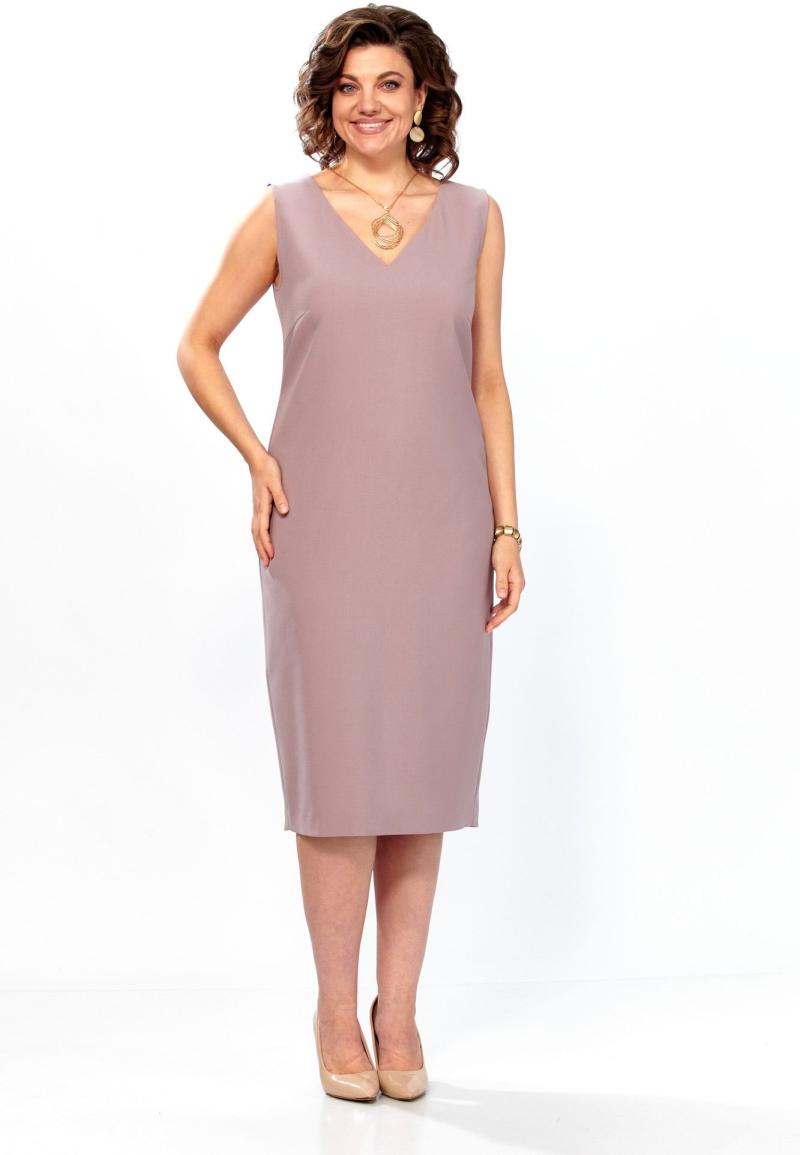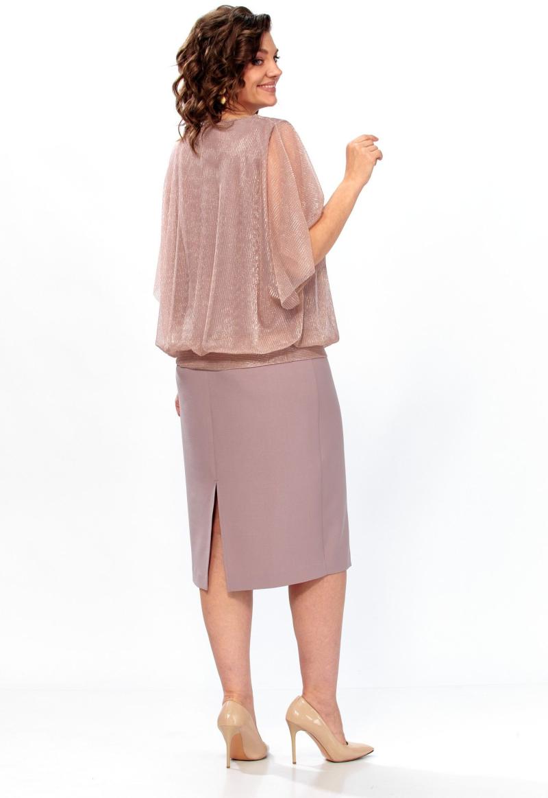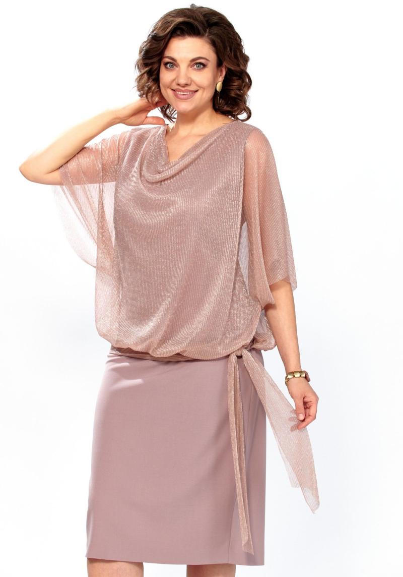 Комплект женский, состоящий из блузки и платья из разных видов ткани. Платье из плательной однотонной ткани с эластаном. Полуприлегающего силуэта, без рукава, вырез горловины глубокий V-образный, по переду нагрудные вытачки, по спинке рельефы от проймы до линии бёдер. Застёжка в изделии по среднему шву спинки от горловины на потайную молнию. По спинке внизу разрез встык. Изделие без подкладки. Блузка из тонкой плиссированной ткани с лёгким люрексом. Свободная,со спущенным цельнокроенным рукавом, по переду по горловине "качели". По низу изделия манжета, переходящая в бант. Изделие без застёжки, без подкладки.