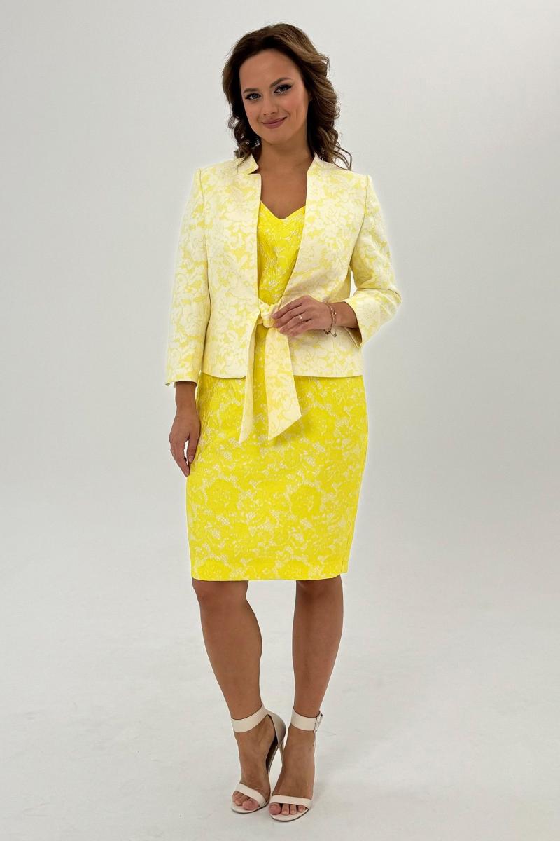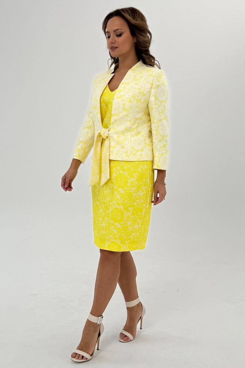 Стильный костюм, состоящий жакета на подкладке и платья без подкладки. Жакет полуприлегающий, выполнен из высококачественного материала. Застежка-бант. Платье полуприлегающего силуэта, с разрезом. Идеальный вариант для стильной и уверенной в себе женщины.