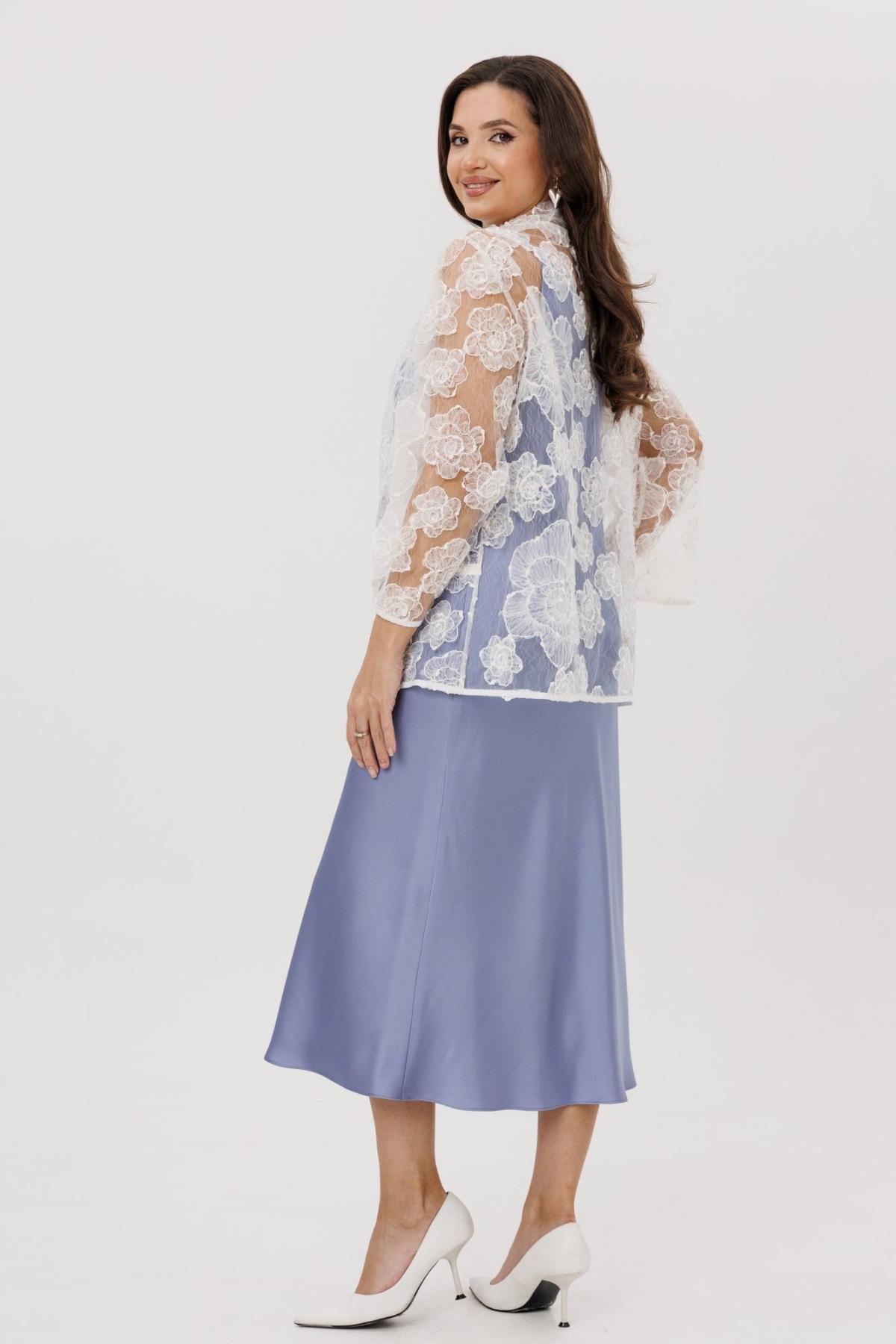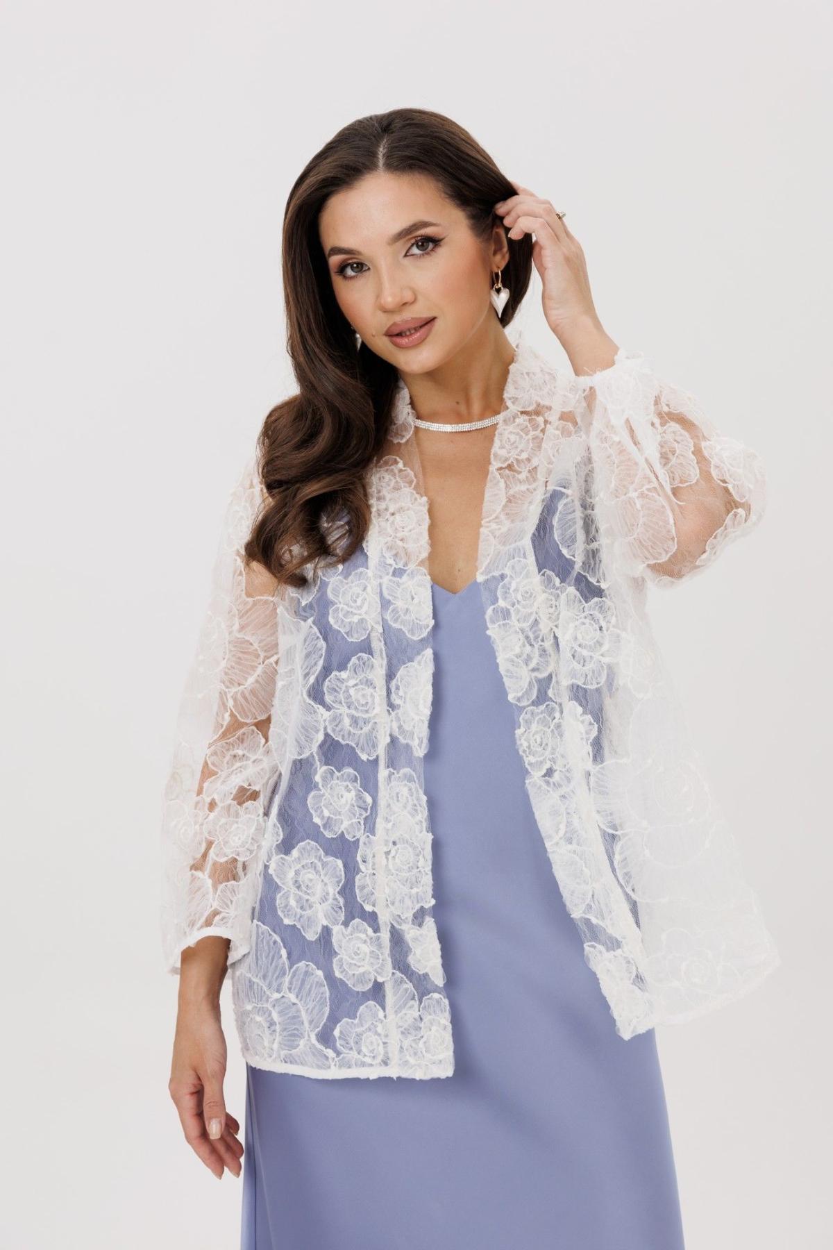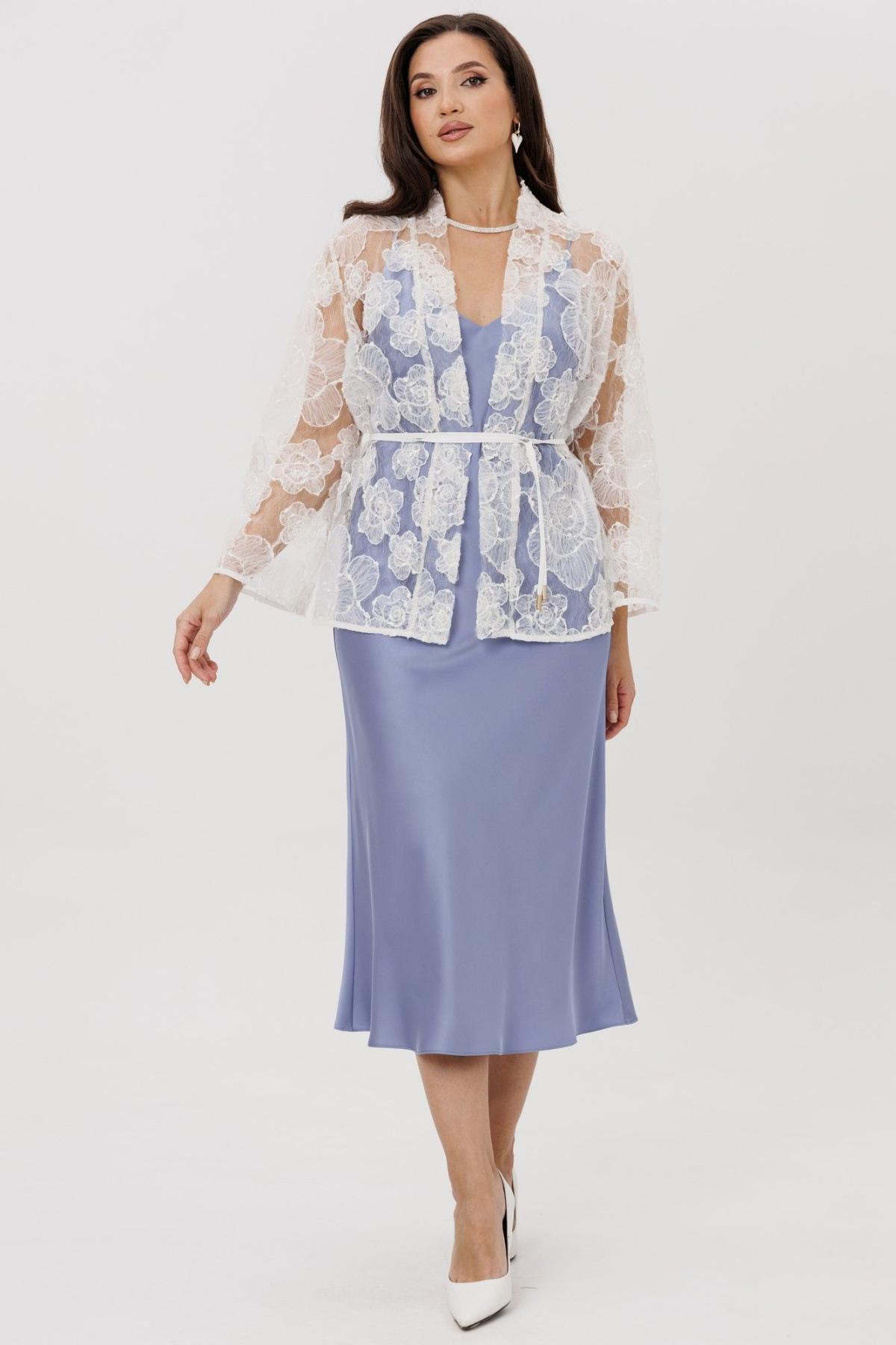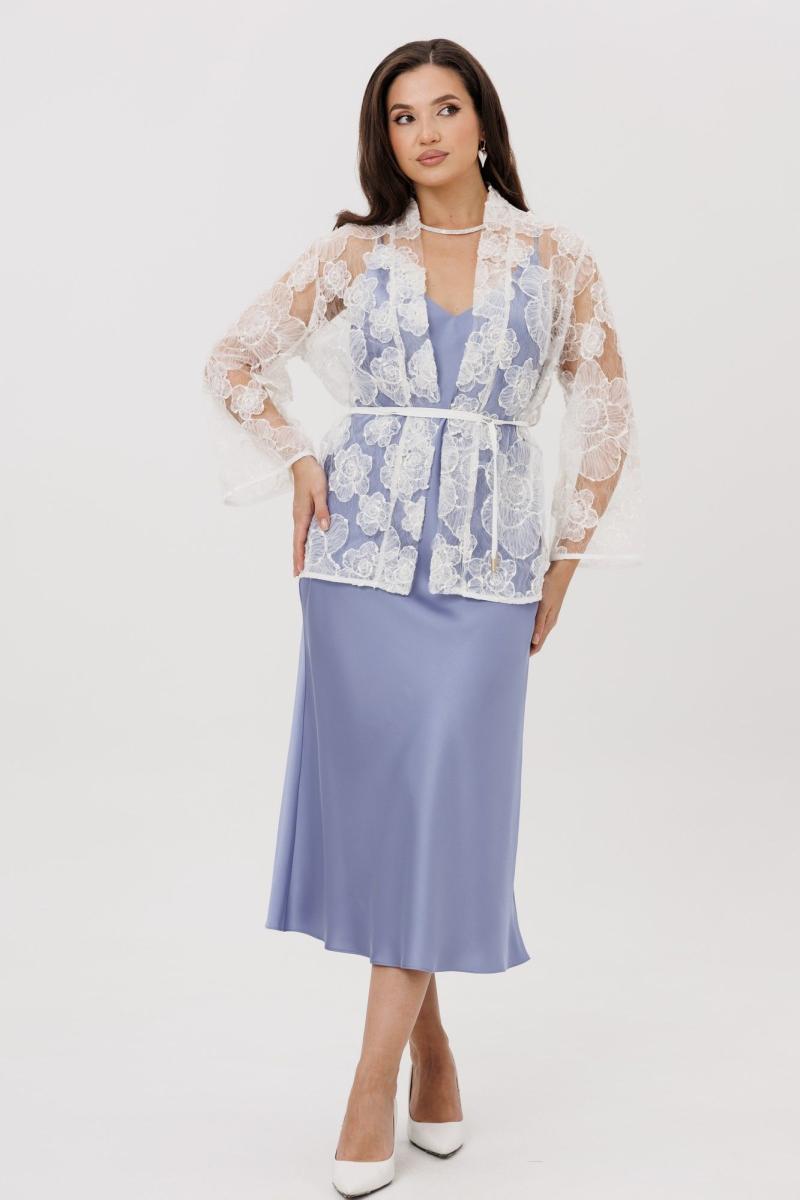 Комплект женский, состоит из жакета (кимоно) и платья-комбинации. Блуза кружевная, свободная без застёжки с притачной планкой, переходящей в стойку. По переду нагрудные вытачки. Платье полуприлегающего силуэта, расклешенное к низу. Перед с нагрудными вытачками. Платье на нерегулируемых бретелях. Верх платья на обтачке. Дополняет модель тонкий пояс.