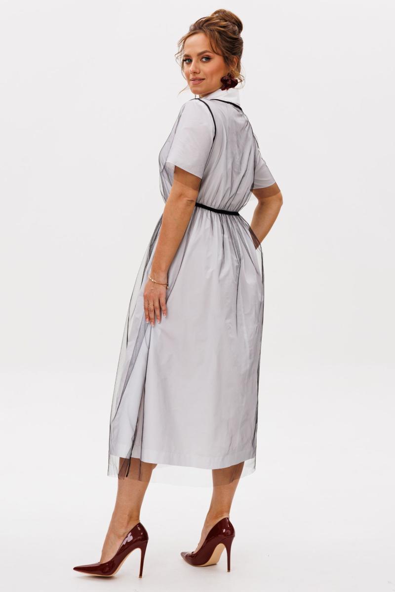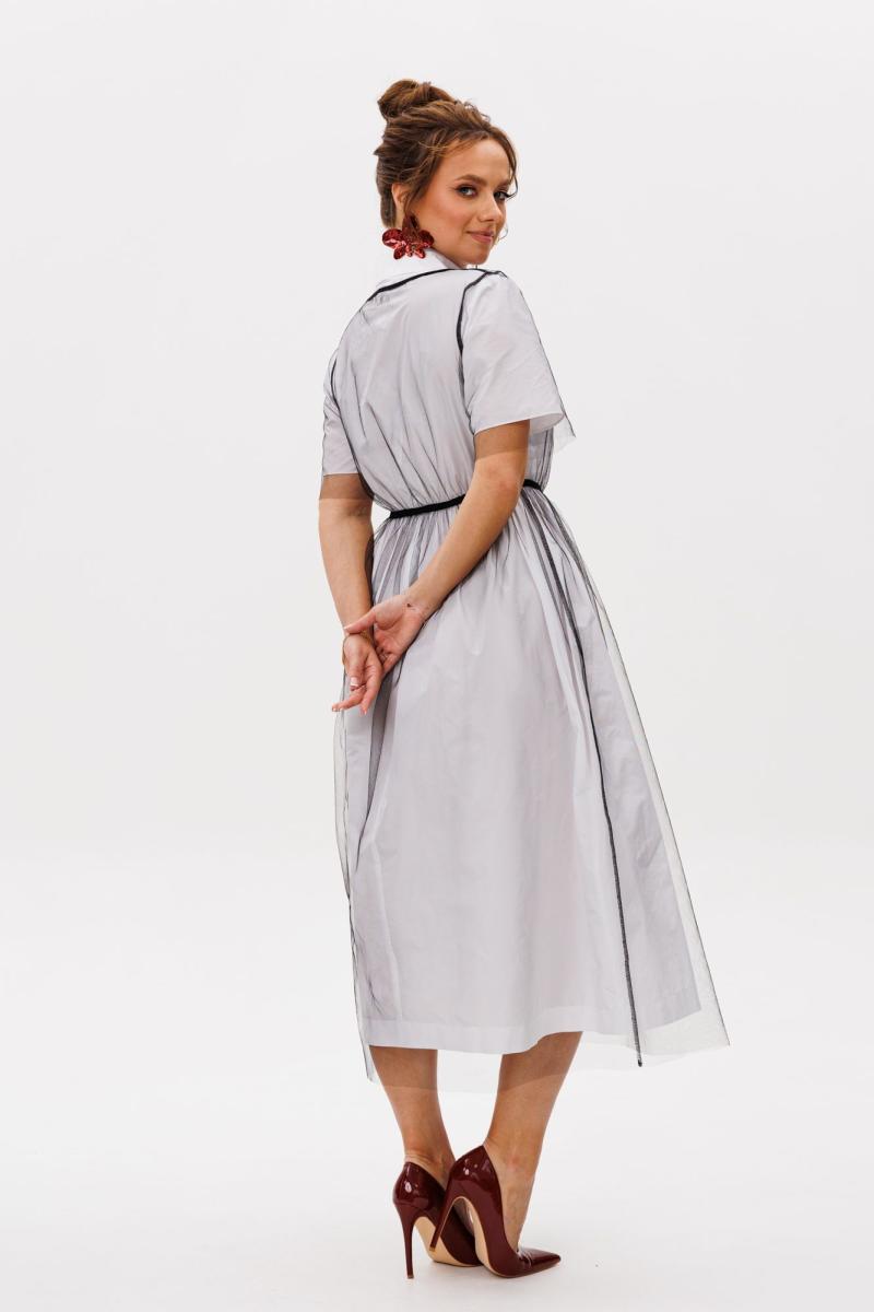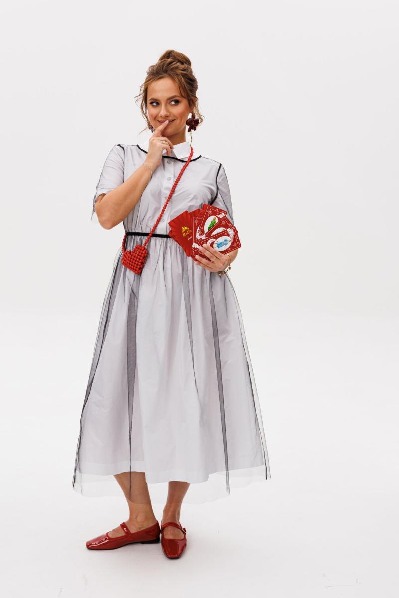 Нарядный женский комплект, состоящий из нижнего платья и платья-накидки. Нижнее платье свободного силуэта, отрезное по линии талии, выполненное из тафты (не тянется). По лифу переда цельнокроеная планка с застежкой на петли-пуговицы. Нижняя часть присборенная по талии, фиксируется резинкой. Рукава одношовные, короткие. Горловина оформлена рубашечным воротником со стойкой. Платье без подкладки. Верхнее платье-накидка свободного силуэта, отрезное по линии талии, выполненное из сетки (тянется). Горловина округлой формы. Рукава втачные, одношовные. Лиф и нижняя часть платья фиксируется резинкой.