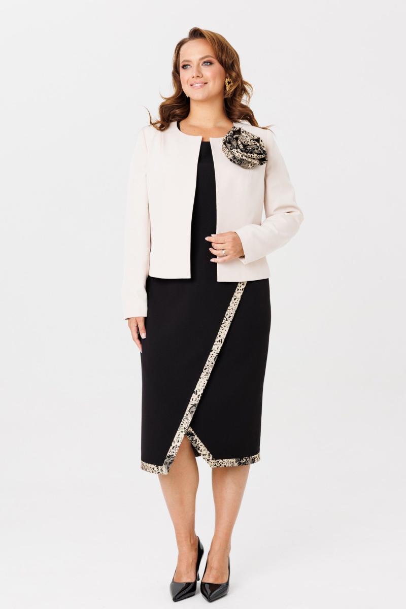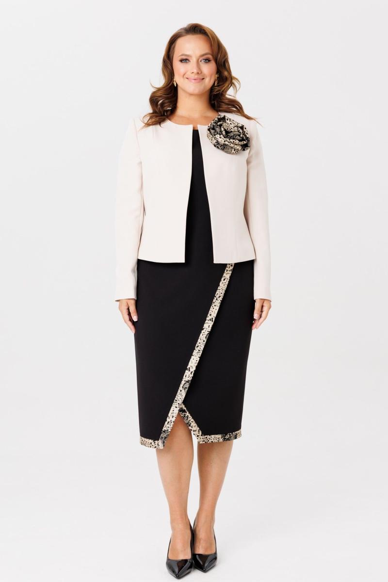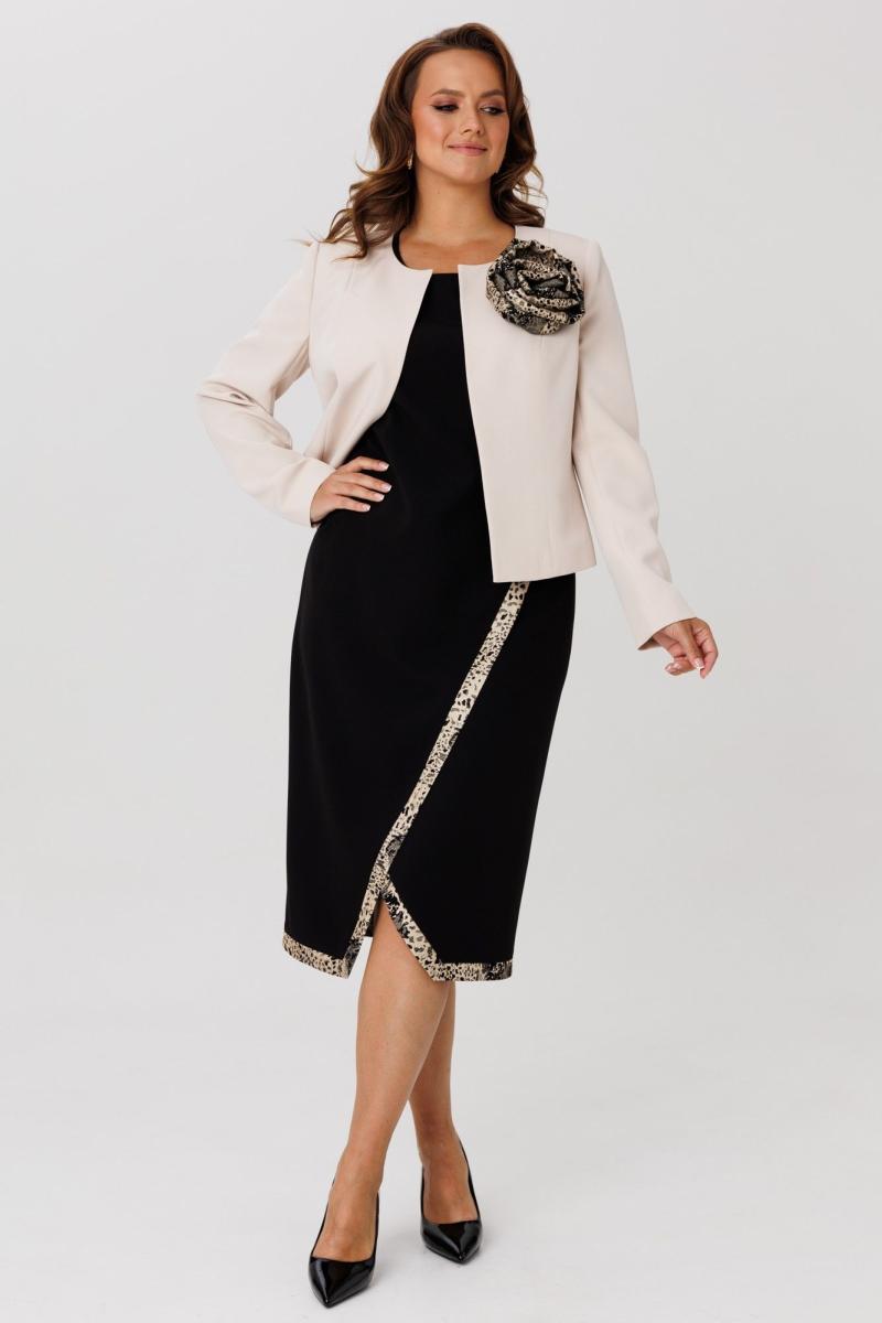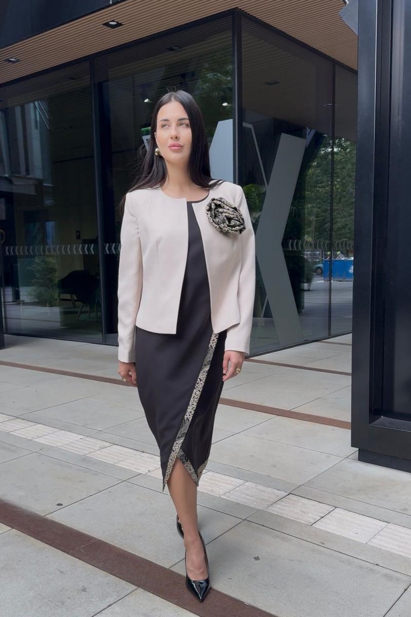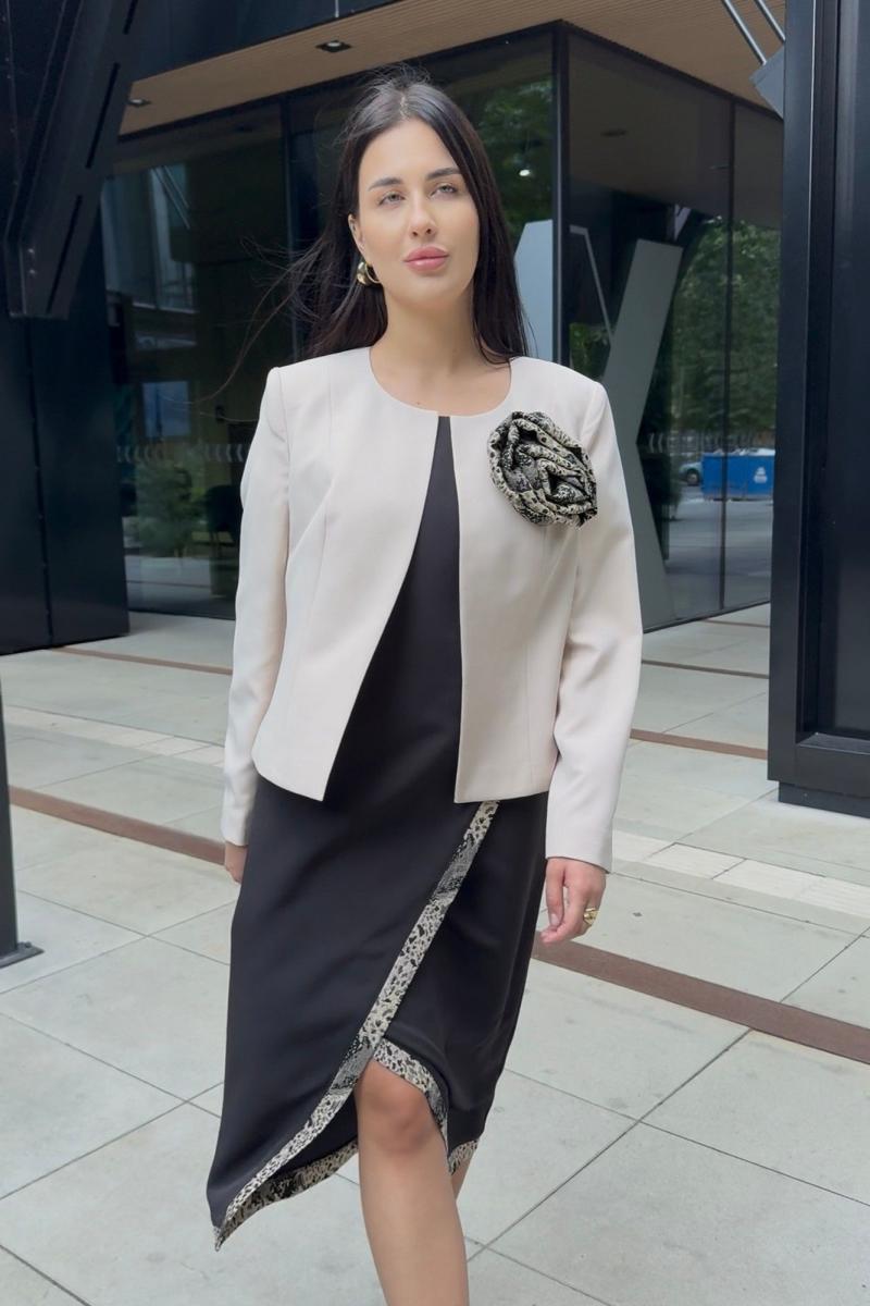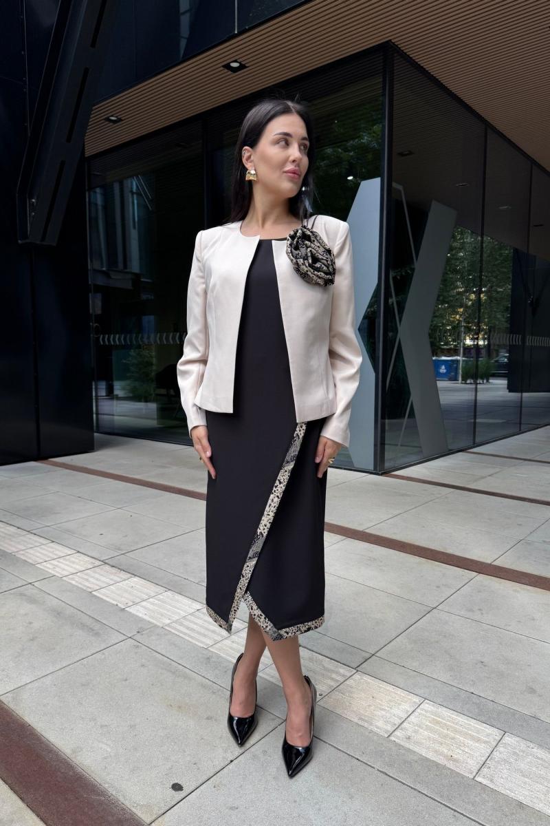 Элегантный женский комплект, состоящий из жакета и платья. Жакет полуприлегающего силуэта, выполнен из костюмной ткани (однотон тянется, дизайн – не тянется), на подкладке. По переду рельефные швы, застежка встык, горловина округлой формы. По спинке средний шов и талиевые вытачки. Рукава втачные, двухшовные. Жакет декорирован съемным цветком из отделочной ткани. Жакет с плечевыми накладками. Платье полуприлегающего силуэта со спущенной линией плеча, выполненное из костюмно-плательной ткани (тянется) с отделкой из жаккардовой ткани. Перед платья состоит из двух частей. Нижняя часть платья отрезная по линии талии с ассиметричным подрезом и отрезными планками из отделочной ткани. Верхняя часть переда ассиметричной формы, отлетная с отделочным люверсом и поясом, с отрезными планками планками из отделочной ткани. По спинке – средний шов, потайная застежка-молния и талиевые вытачки. Низ переда и спинки, низ рукавов оформлен отрезными планками из отделочной ткани. Горловина округлой формы.