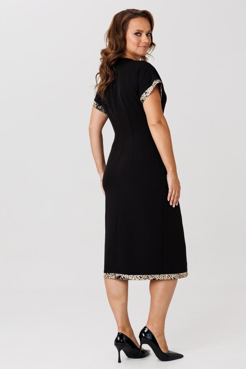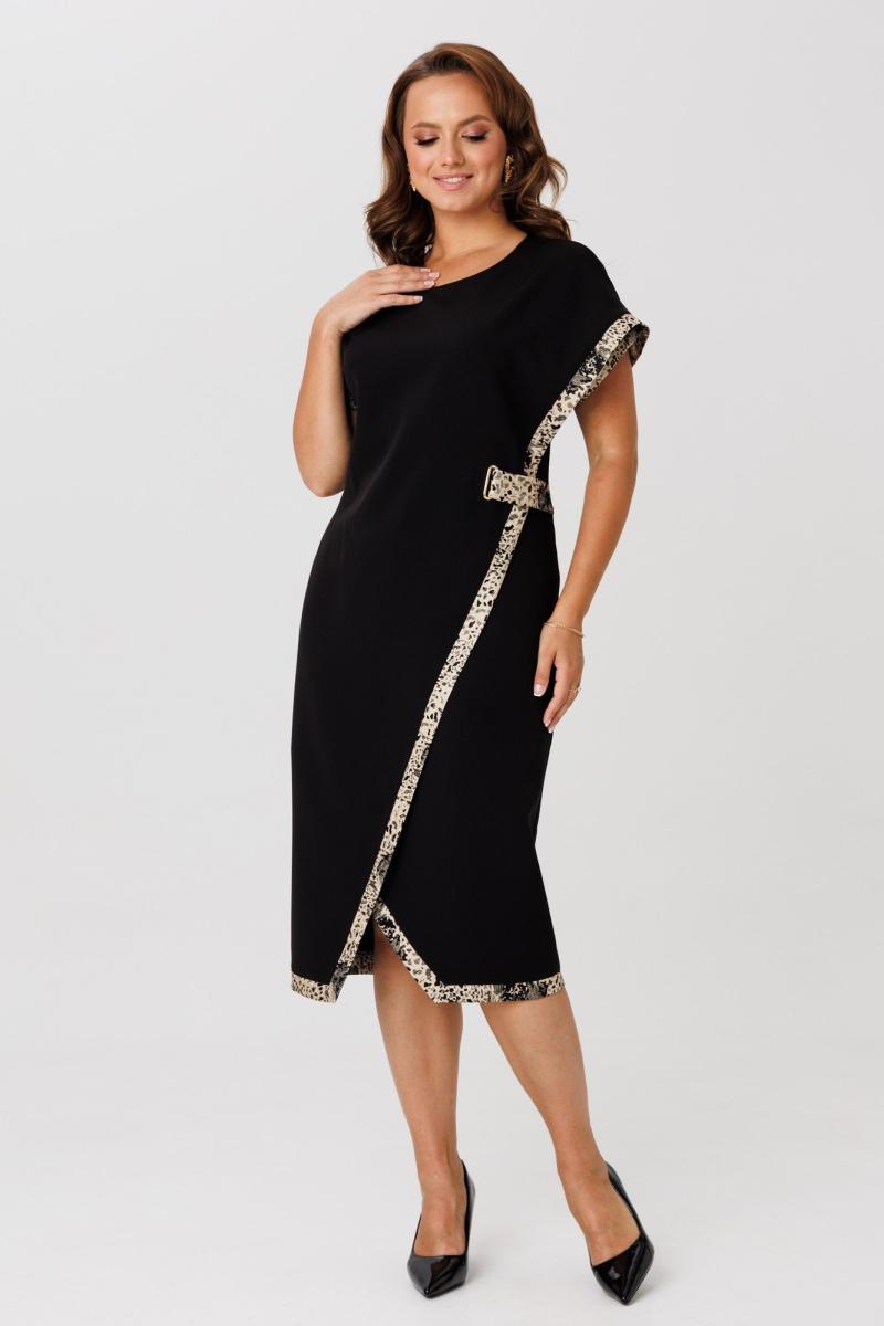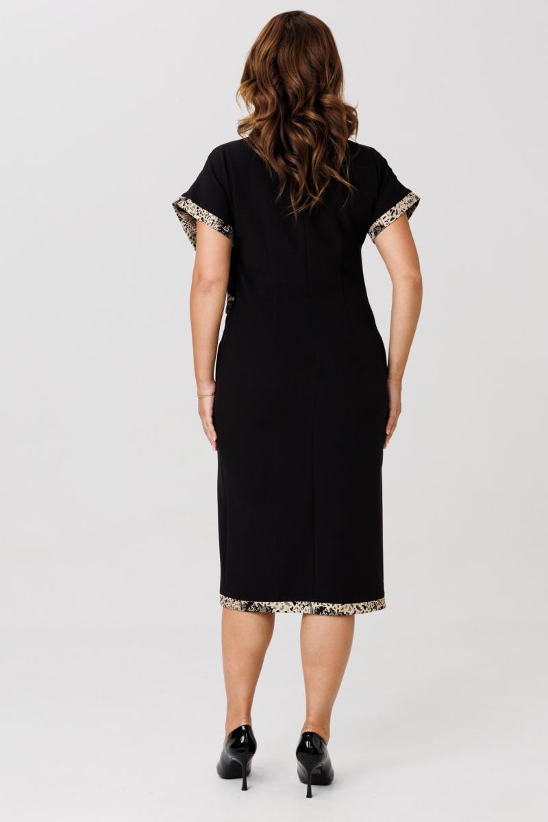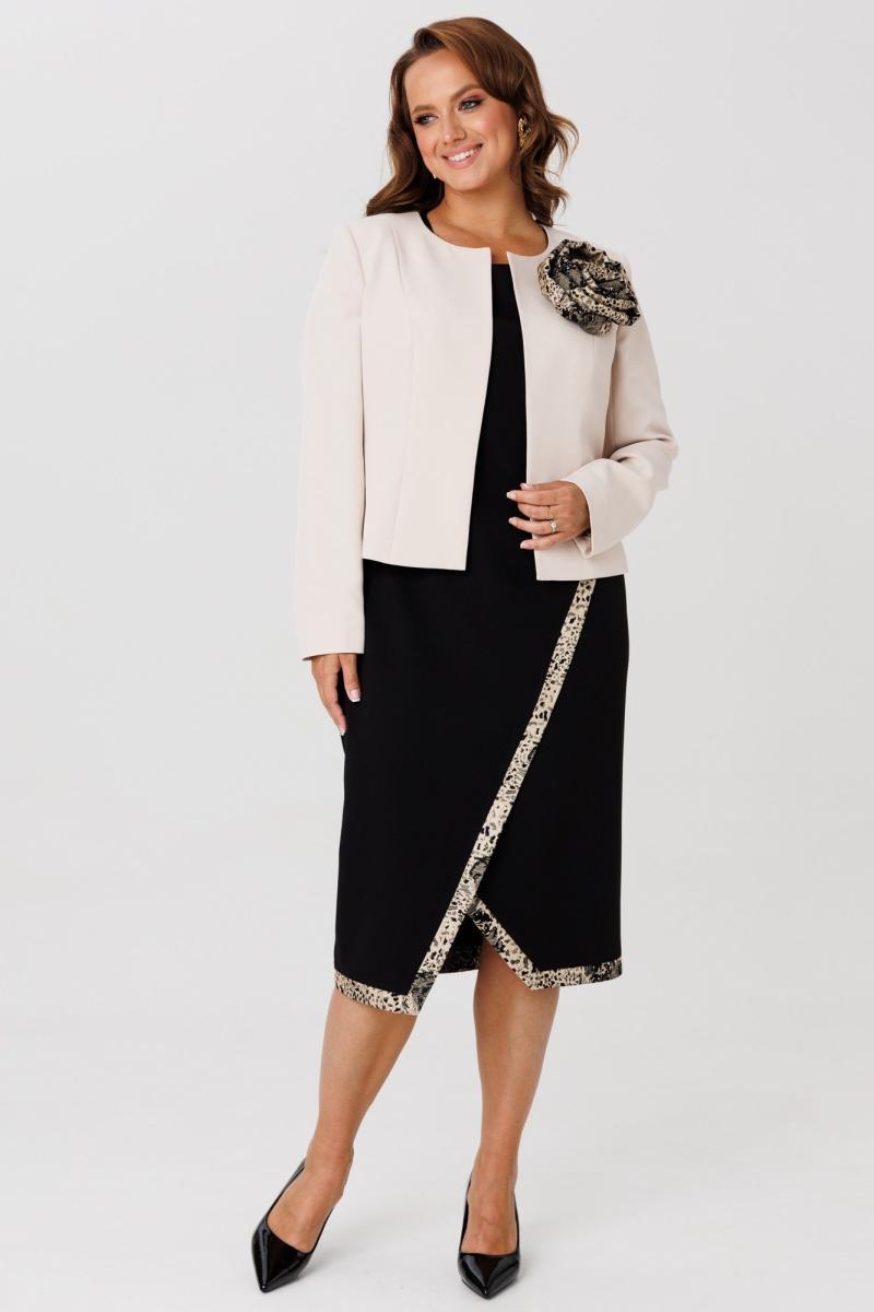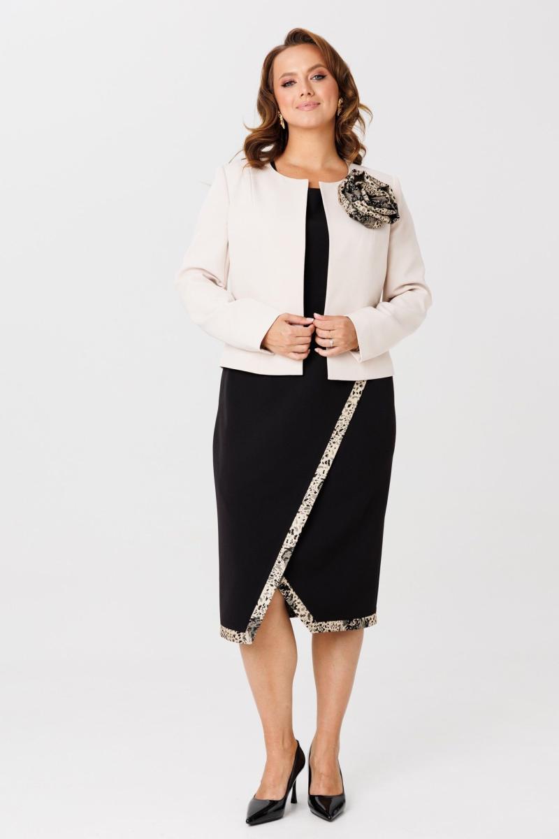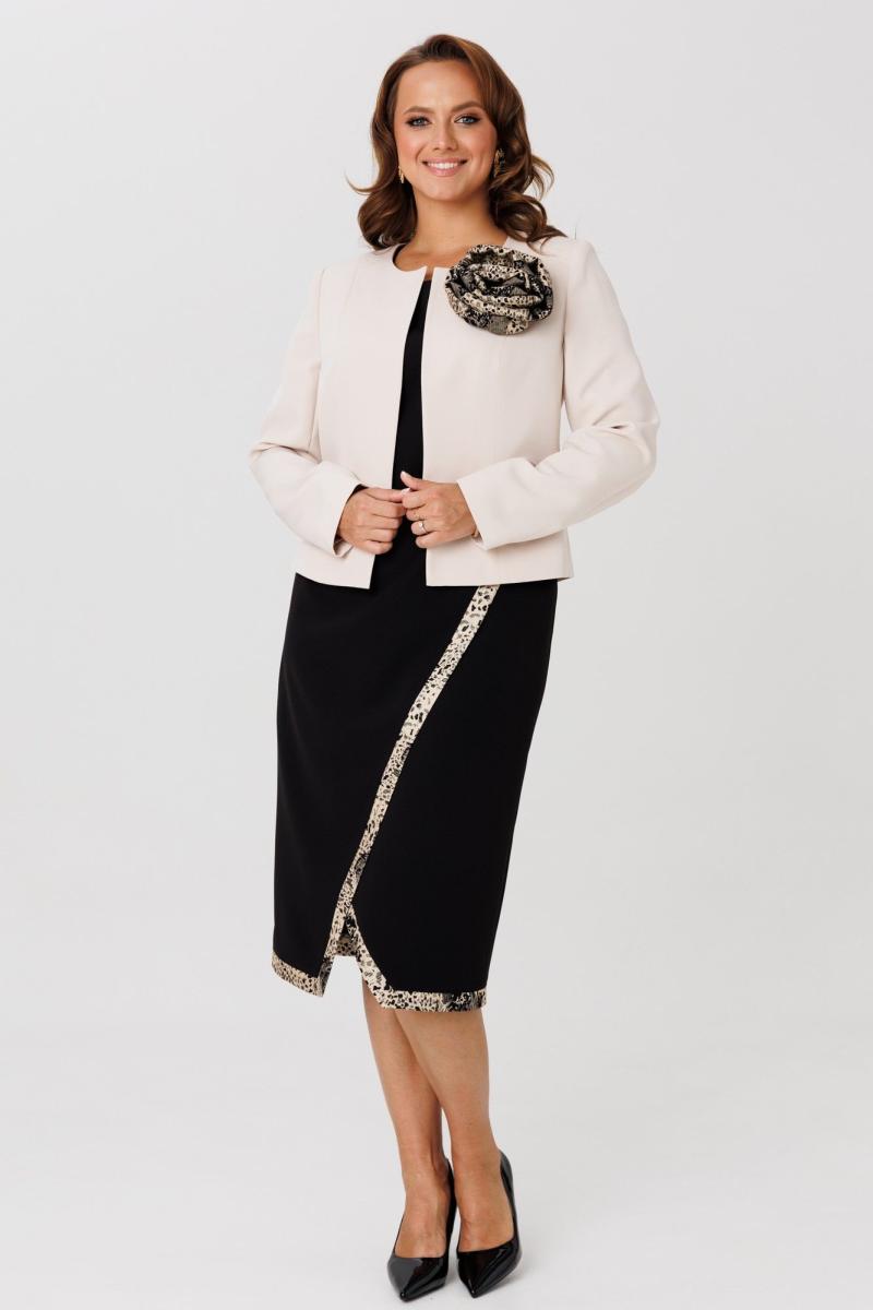 Элегантный женский комплект, состоящий из жакета и платья. Жакет полуприлегающего силуэта, выполнен из костюмной ткани (однотон тянется, дизайн – не тянется), на подкладке. По переду рельефные швы, застежка встык, горловина округлой формы. По спинке средний шов и талиевые вытачки. Рукава втачные, двухшовные. Жакет декорирован съемным цветком из отделочной ткани. Жакет с плечевыми накладками. Платье полуприлегающего силуэта со спущенной линией плеча, выполненное из костюмно-плательной ткани (тянется) с отделкой из жаккардовой ткани. Перед платья состоит из двух частей. Нижняя часть платья отрезная по линии талии с ассиметричным подрезом и отрезными планками из отделочной ткани. Верхняя часть переда ассиметричной формы, отлетная с отделочным люверсом и поясом, с отрезными планками планками из отделочной ткани. По спинке – средний шов, потайная застежка-молния и талиевые вытачки. Низ переда и спинки, низ рукавов оформлен отрезными планками из отделочной ткани. Горловина округлой формы.