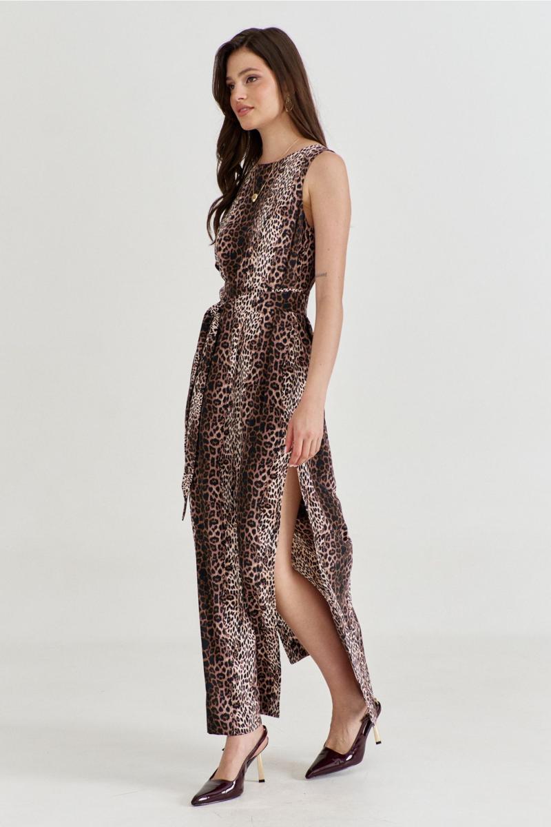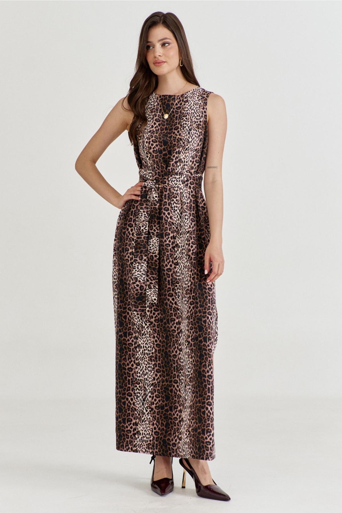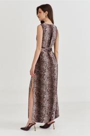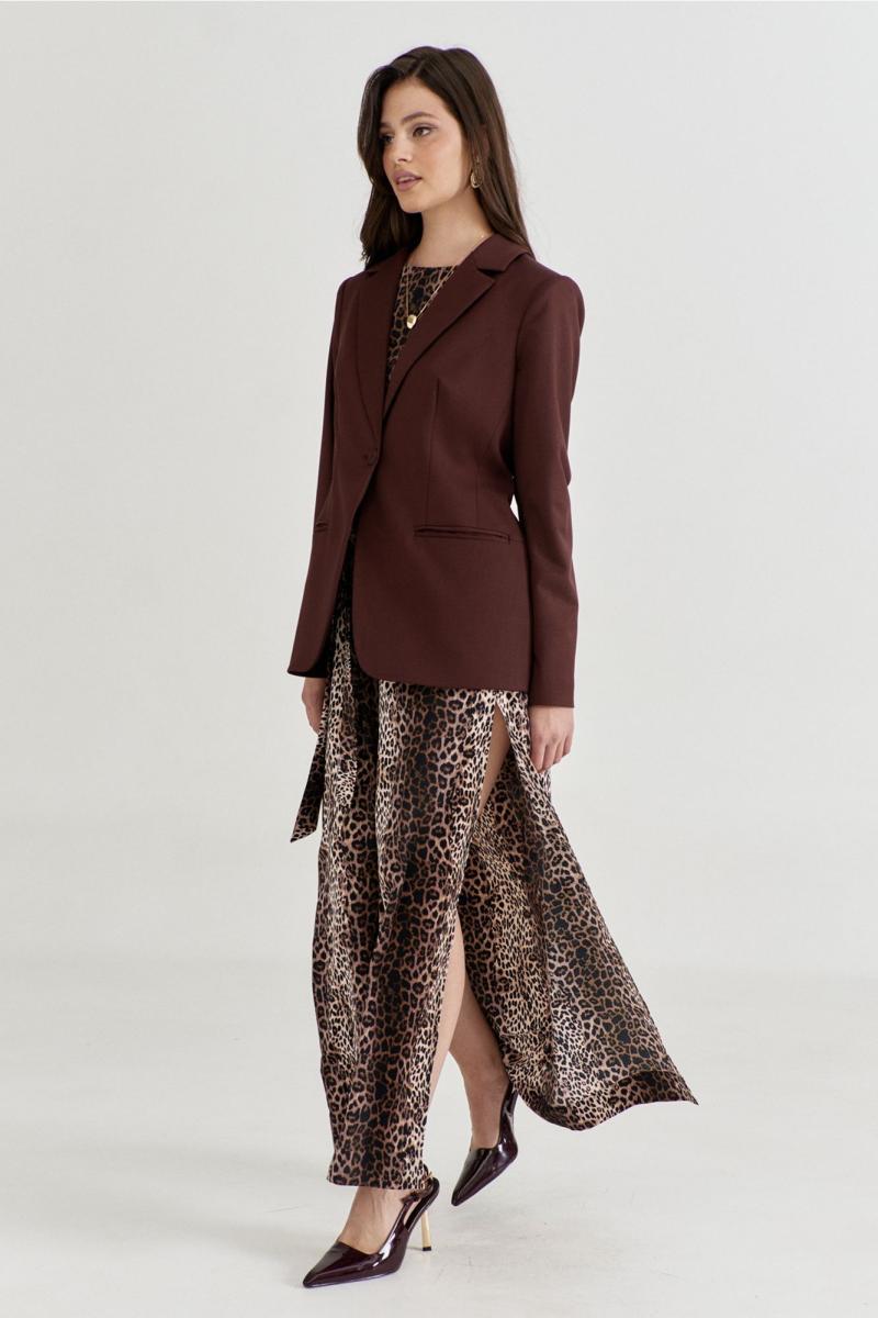 Костюм, состоящий из жакета и платья. Жакет полуприлегающего силуэта, длиной ниже линии бедер. Спинка со средним швом, в котором обработана шлица, с рельефами от пройм до низа. Перед с нагрудной вытачкой, рельефом и прорезным карманом «в рамку». Рукава двушовные, втачные, длинные. Воротник пиджачного типа с лацканом. Застежка на петлю и пуговицу. Жакет на подкладке. Платье свободного кроя, длиной макси. Спинка по горловине с разрезом, в котором обработана застежка на навесную петельку и пришивную пуговицу. По переду нагрудные вытачки. В боковых швах обработаны карманы и высокие разрезы. Горловина округлой формы, без воротника. Платье без рукавов. Платье дополняет съемный пояс.