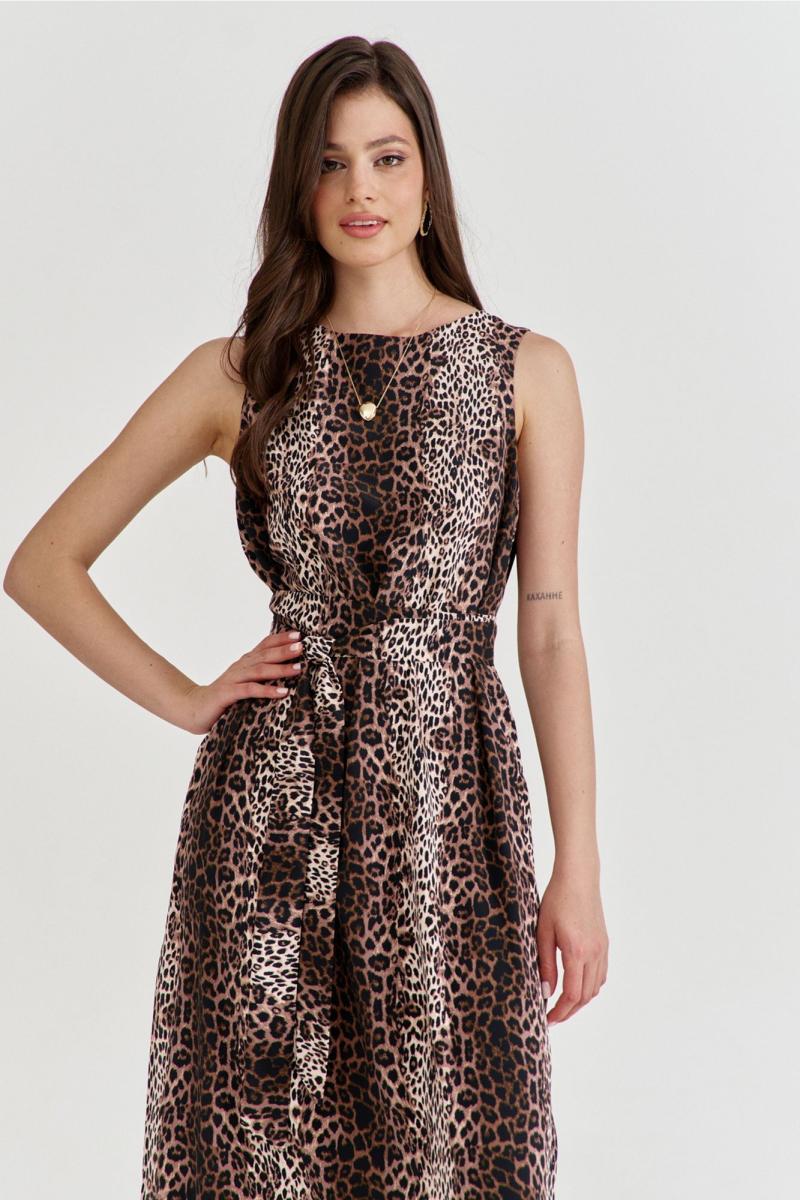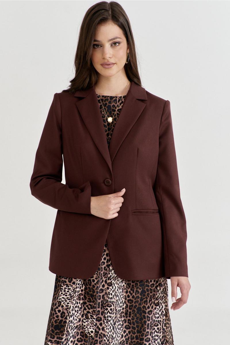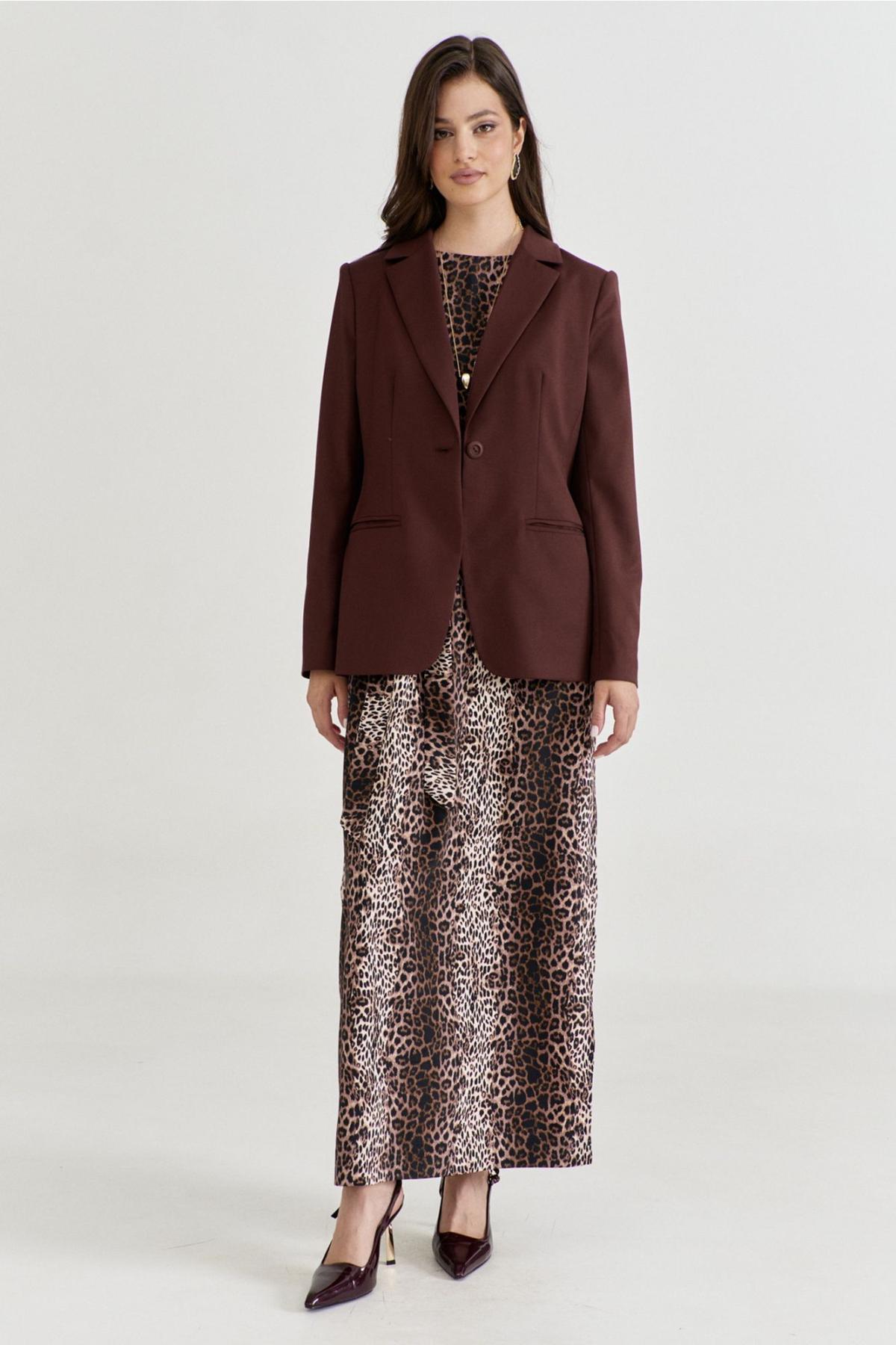 Костюм, состоящий из жакета и платья. Жакет полуприлегающего силуэта, длиной ниже линии бедер. Спинка со средним швом, в котором обработана шлица, с рельефами от пройм до низа. Перед с нагрудной вытачкой, рельефом и прорезным карманом «в рамку». Рукава двушовные, втачные, длинные. Воротник пиджачного типа с лацканом. Застежка на петлю и пуговицу. Жакет на подкладке. Платье свободного кроя, длиной макси. Спинка по горловине с разрезом, в котором обработана застежка на навесную петельку и пришивную пуговицу. По переду нагрудные вытачки. В боковых швах обработаны карманы и высокие разрезы. Горловина округлой формы, без воротника. Платье без рукавов. Платье дополняет съемный пояс.