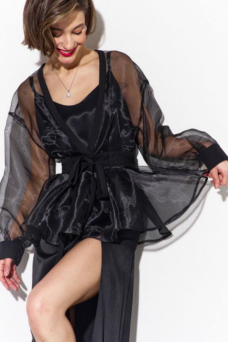 Комплект (блузка и платье): - блузка полуприлегающего силуэта, длиной до линии бедер. - блузка с притачным поясом по талии из отделочной ткани -линия плеча спущена, рукава одношовные, втачные, длинные - по поясу притачаны шлевки и вставлен пояс - платье свободного кроя на бретелях длиной макси - по переду с ассиметричный рельеф