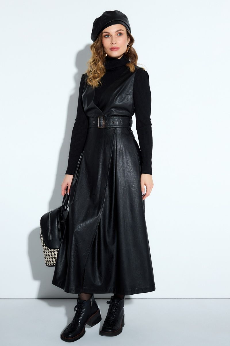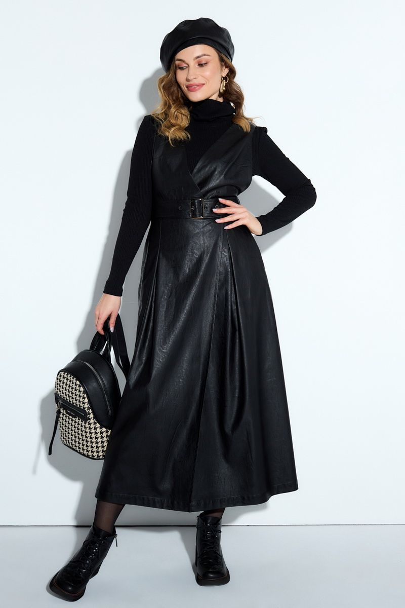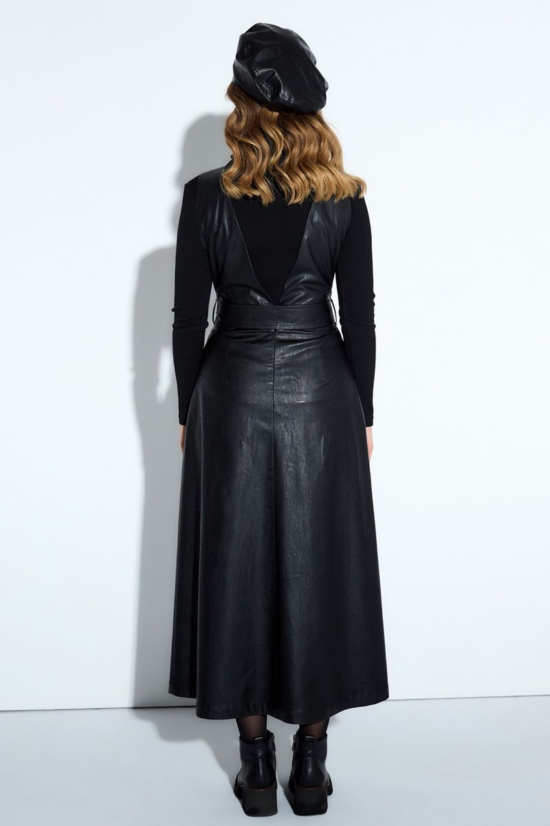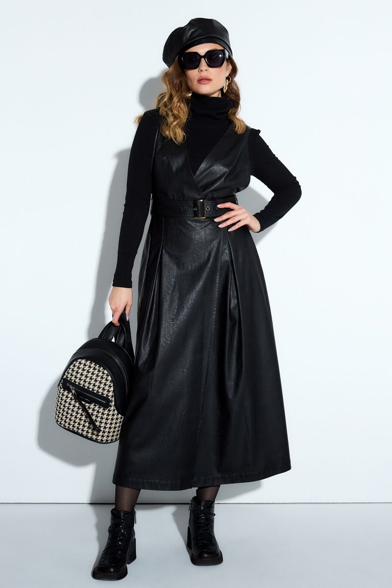 Комплект-двойка из гольфа и сарафана. Гольф из трикотажной ткани в рубчик. Длинный рукав, круглый вырез горловины. Сарафан из эко-кожи полуприлегающего силуэта. Лиф с v-образным глубоким вырезом, юбка расширенного силуэта с запахом длиной миди, на притачном поясе, имеет дополнительно съемный пояс. Карманы в боковых швах, застежка на потайную молнию по спинке, без подкладки. на сарафана 126 Длина гольфа 56 Длина рукава 57