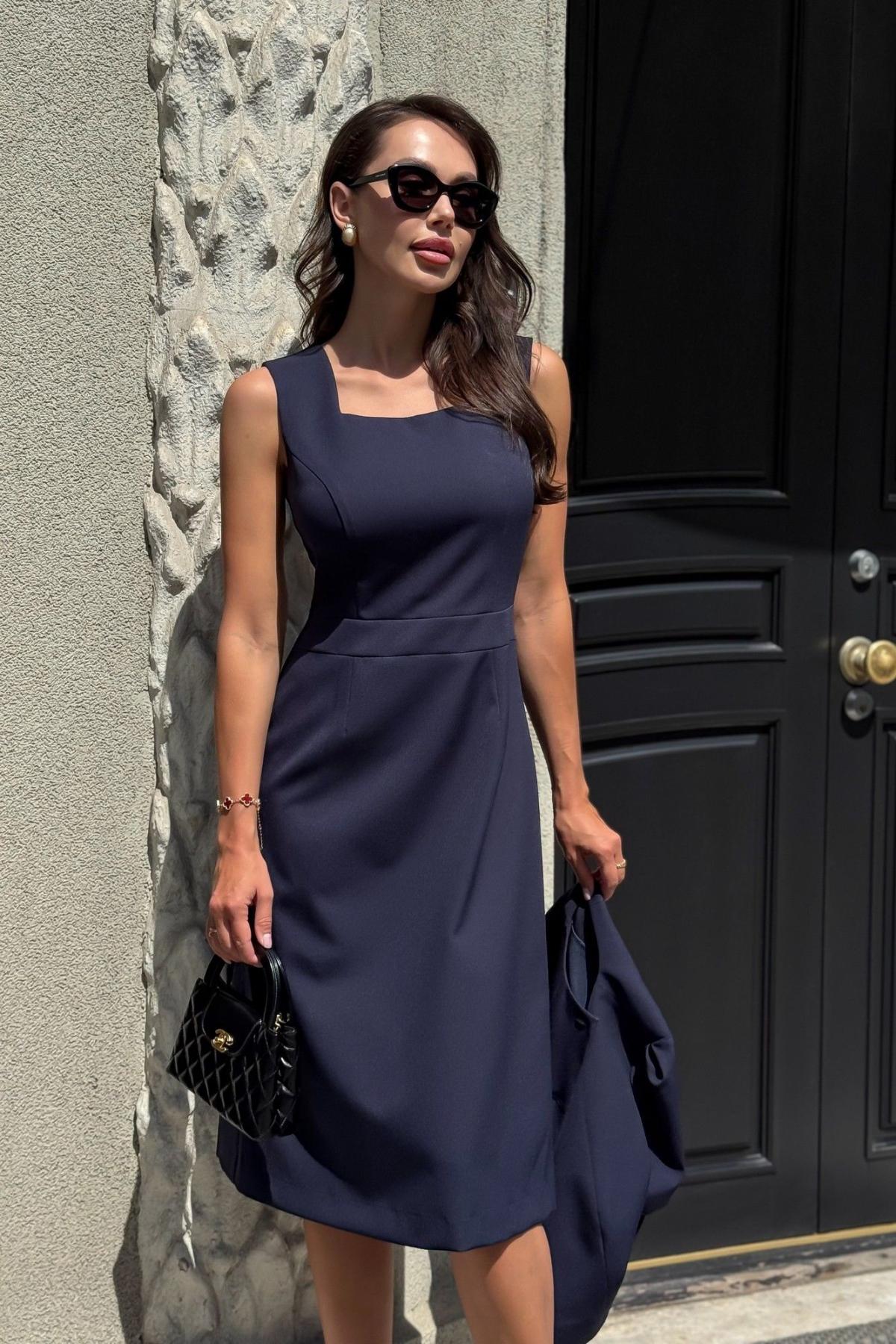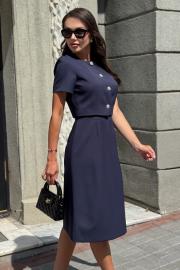 Элегантный женский костюм с платьем тёмно-синий — универсальное решение для офиса, торжественных мероприятий, свадьбы или деловых встреч. Этот классический костюм двойка состоит из изысканного платья без рукавов и укороченного жакета с декоративными пуговицами. Приталенный силуэт подчёркивает фигуру и создаёт стильный образ для любого случая. Комплект женский 2-х предметный, состоящий из укороченного жакета и платья, выполненного из костюмно-плательной ткани. Комплект предназначен как для нарядной, так и для повседневной носки. Жакет укороченный, прилегающего силуэта, перед и спинка на подкладке, с центральной бортовой застежкой до верха на 4 петли и 4 пуговицы (размер и цвет фурнитуры может незначительно отличаться от фото). Перед с рельефными швами, проходящими через центр груди, идущими от горловины до низа. Спинка со средним швом, с рельефными швами, идущими от пройм до низа. Горловина переда и спинки округлой формы, обтачная. Рукава втачные, одношовные, короткие, со встречной складкой от плеча, без подкладки. Платье женское полуприлегающего силуэта, слегка расширенное к низу, отрезное по линии талии с притачным поясом, без рукавов, на отлетной по низу подкладке. Верхняя часть переда с рельефными швами, проходящими через центр груди и идущими из пройм, вниз до пояса. Верхняя часть спинки с рельефными швами, идущими из пройм, вниз до пояса. Нижняя часть переда и спинки с талиевыми вытачками, от пояса вниз. Спинка в верхних и нижних частях со средним швом, в котором от горловины вниз обработана застежка на потайную тесьму - ""молнию"". Горловина спинки и переда ""каре"". Проймы и горловина обтачные. " 44 размер Жакет Длина по среднему шву спинки - 40,5 см (±1,5 см), Ширина спинки - 37,0 см (±0,5 см), Ширина на уровне глубины проймы - 48,0 см (±1,0 см), Ширина по низу изделия - 42,0 см (±1,0 см), Длина рукава - 21,5 см (±1,0 см), Ширина рукава вверху - 17,0 см (±1,0 см), Длина плеча - 10,3 см (±0,5см). Платье Длина по среднему шву спинки - 102,5 см (±2,0 см), Ширина спинки - 35,0 см (±0,5 см), Ширина на уровне глубины проймы - 45,0 см (±1,0 см), Ширина на уровне линии талии - 39,0 см(±1,0 см), Ширина на уровне линии бедер - 49,0 см (±1,0 см), Длина плеча - 7,3 см (±0,5 см), Ширина по низу платья - 62,0 см (±1,0 см). 46 размер Жакет Длина по среднему шву спинки - 40,5 см (±1,5 см), Ширина спинки - 37,0 см (±0,5 см), Ширина на уровне глубины проймы - 50,0 см (±1,0 см), Ширина по низу изделия - 44,0 см (±1,0 см), Длина рукава - 21,5 см (±1,0 см), Ширина рукава вверху - 17,5 см (±1,0 см), Длина плеча - 10,3 см (±0,5см). Платье Длина по среднему шву спинки - 102,5 см (±2,0 см), Ширина спинки - 35,0 см (±0,5 см), Ширина на уровне глубины проймы - 47,0 см (±1,0 см), Ширина на уровне линии талии - 41,0 см(±1,0 см), Ширина на уровне линии бедер - 51,0 см (±1,0 см), Длина плеча - 7,3 см (±0,5 см), Ширина по низу платья - 64,0 см (±1,0 см). 48 размер Жакет Длина по среднему шву спинки - 41,0 см (±1,5 см), Ширина спинки - 39,3 см (±0,5 см), Ширина на уровне глубины проймы - 52,0 см (±1,0 см), Ширина по низу изделия - 46,5 см (±1,0 см), Длина рукава - 21,5 см (±1,0 см), Ширина рукава вверху - 18,5 см (±1,0 см), Длина плеча - 10,5 см (±0,5см). Платье Длина по среднему шву спинки - 103,5 см (±2,0 см), Ширина спинки - 36,5 см (±0,5 см), Ширина на уровне глубины проймы - 49,0 см (±1,0 см), Ширина на уровне линии талии - 43,5 см(±1,0 см), Ширина на уровне линии бедер - 54,0 см (±1,0 см), Длина плеча - 7,7 см (±0,5 см), Ширина по низу платья - 67,0 см (±1,0 см). 50 размер Жакет Длина по среднему шву спинки - 41,0 см (±1,5 см), Шири